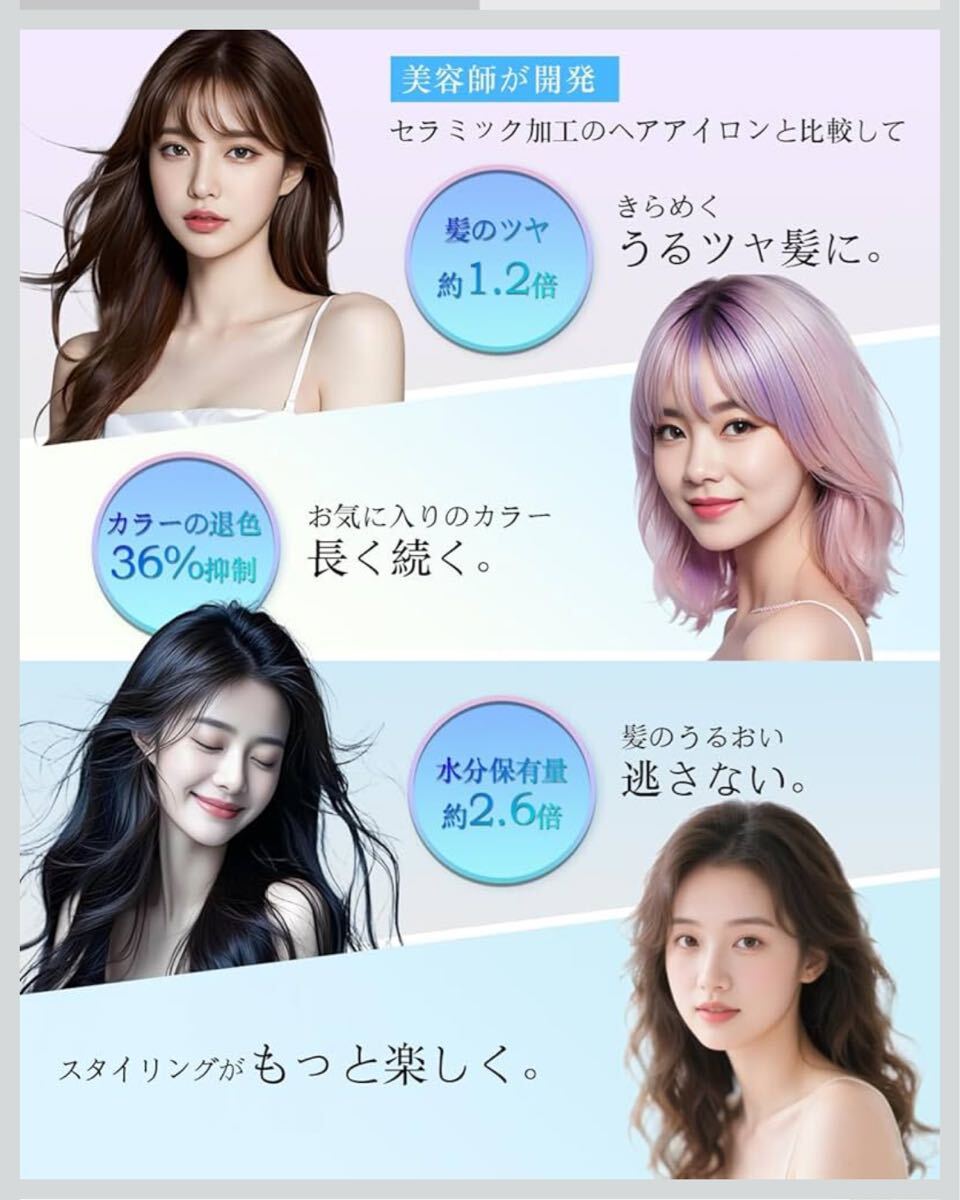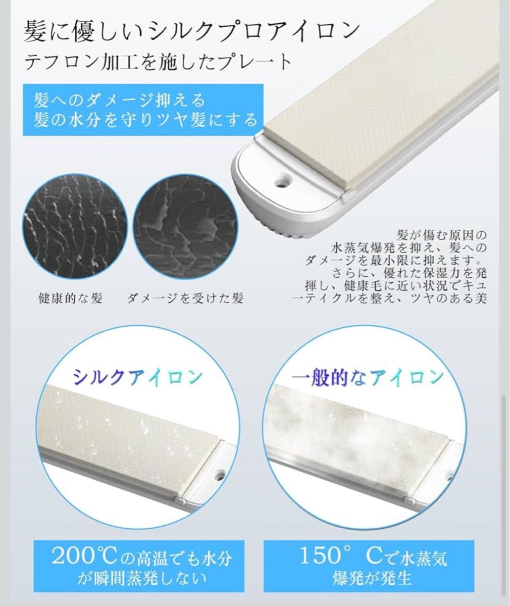業界初の布製プレート:本ヘアアイロンは、従来の金属プレートとは異なり、布製のヒーターカバーを採用しています。熱が髪に直接触れにくい構造で、過度な加熱を抑え、ヘアダメージのリスクを低減します。使用時に気になるような焦げたニオイも発生しにくく、繊細な髪やダメージヘアの方にも使いやすい設計です。なめらかなストレートヘアと自然なツヤ感をサポートします。