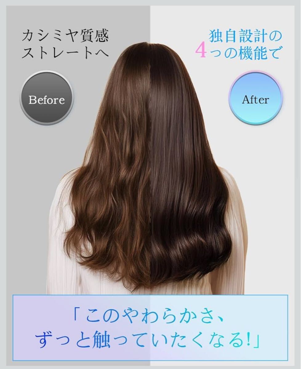 ムラのない仕上がり:布製プレートは、熱をやわらかく均一に伝える構造で、髪全体を包み込むようにスタイリングできます。ストレートに仕上げた際も自然なツヤ感とまとまりが生まれ、ピンと張らないナチュラルな印象に。毛先の動きや内巻きなど、繊細なニュアンスの表現にも対応しています。