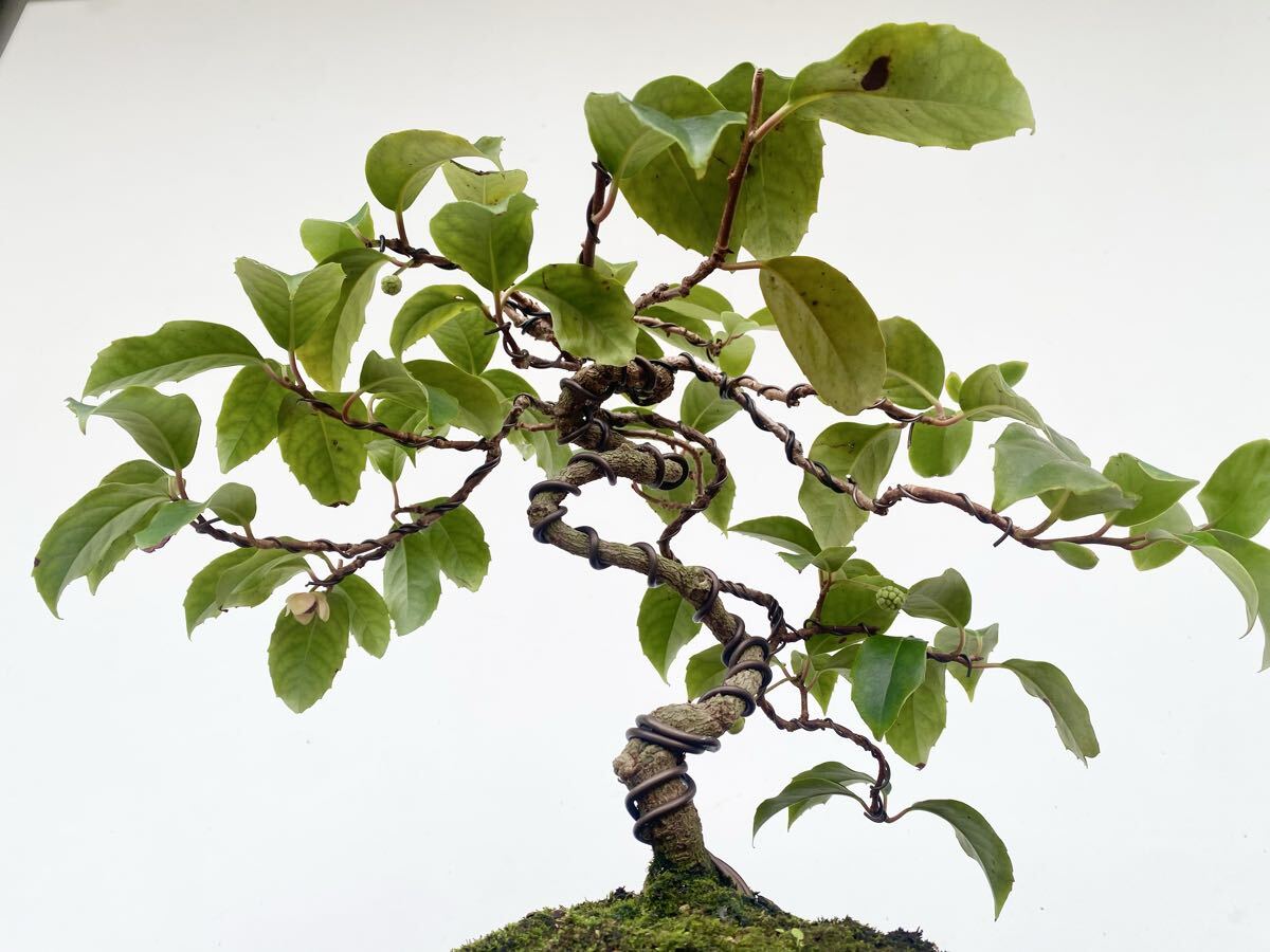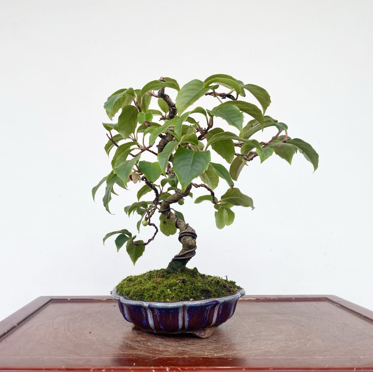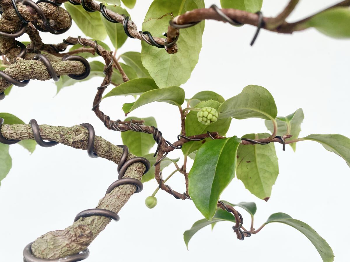 秋には、小さな実が集合してできる球状の真っ赤な集合果が枝からぶら下がり、盆栽の中でも一際目を引く存在として飾られます。