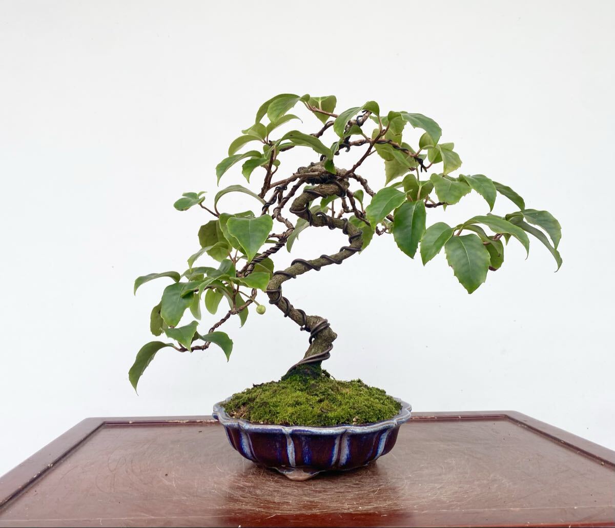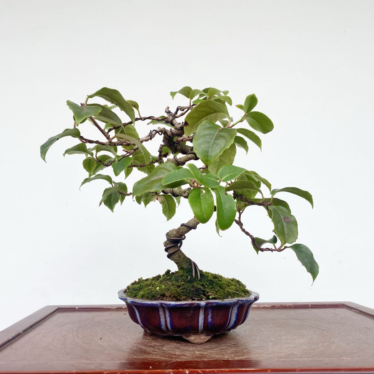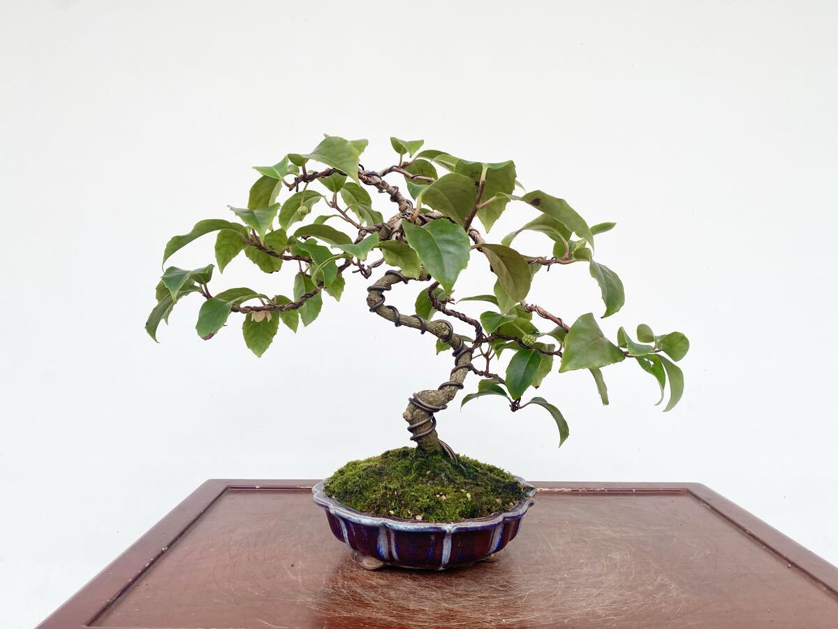 秋には、小さな実が集合してできる球状の真っ赤な集合果が枝からぶら下がり、盆栽の中でも一際目を引く存在として飾られます。