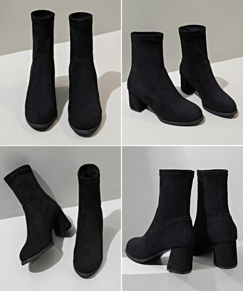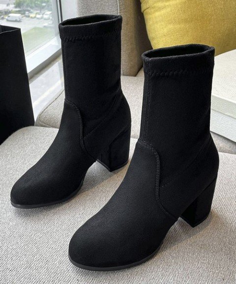 おしゃれ ストレッチブーツ チャンキーヒール レディース 美脚ブーティ ラウンドトゥミドルブーツ 黒 通勤 歩きやすい靴