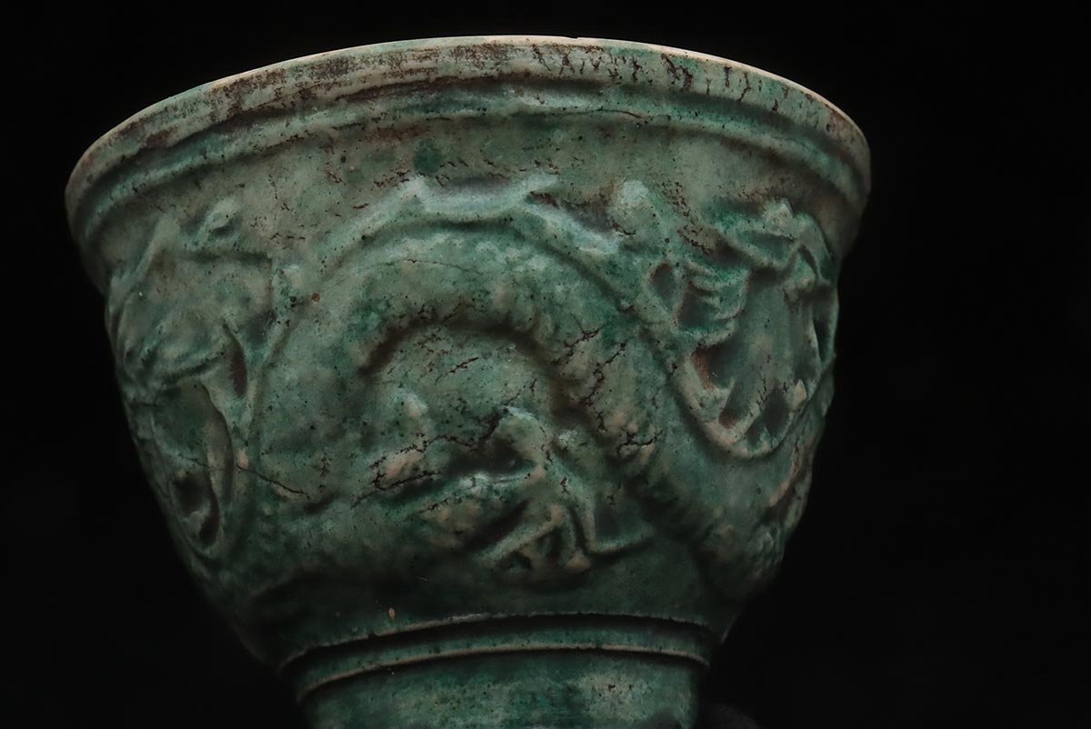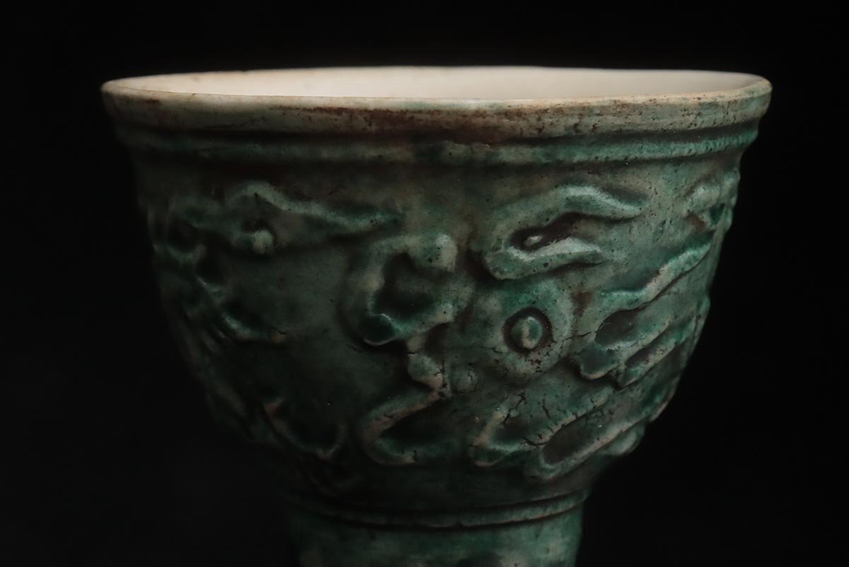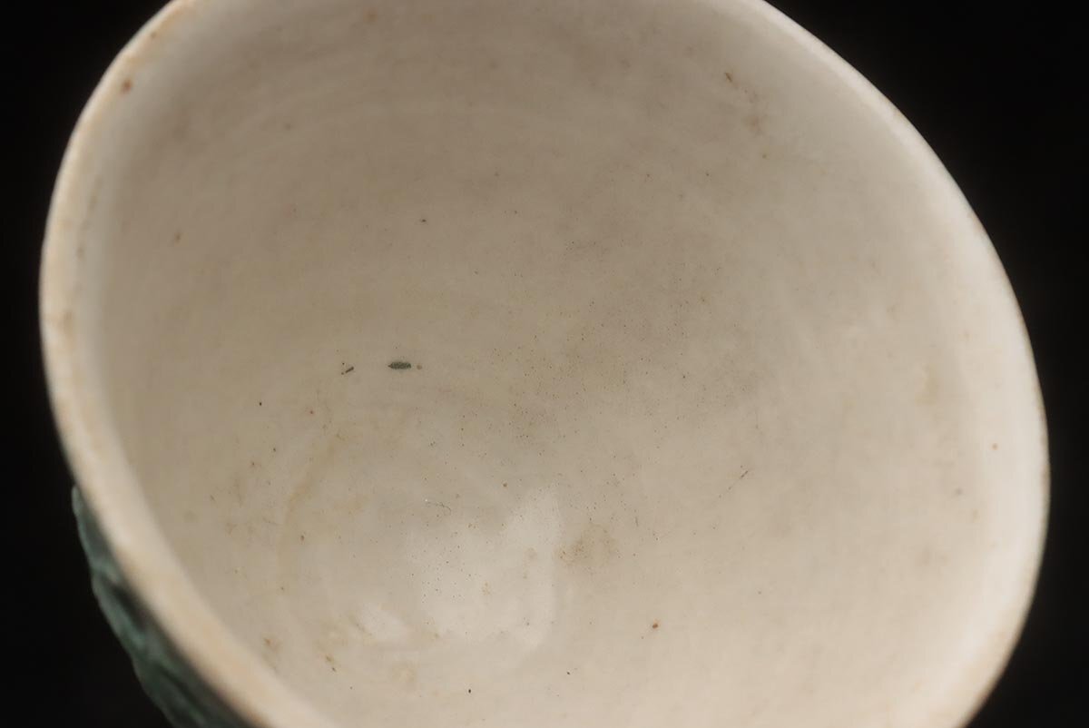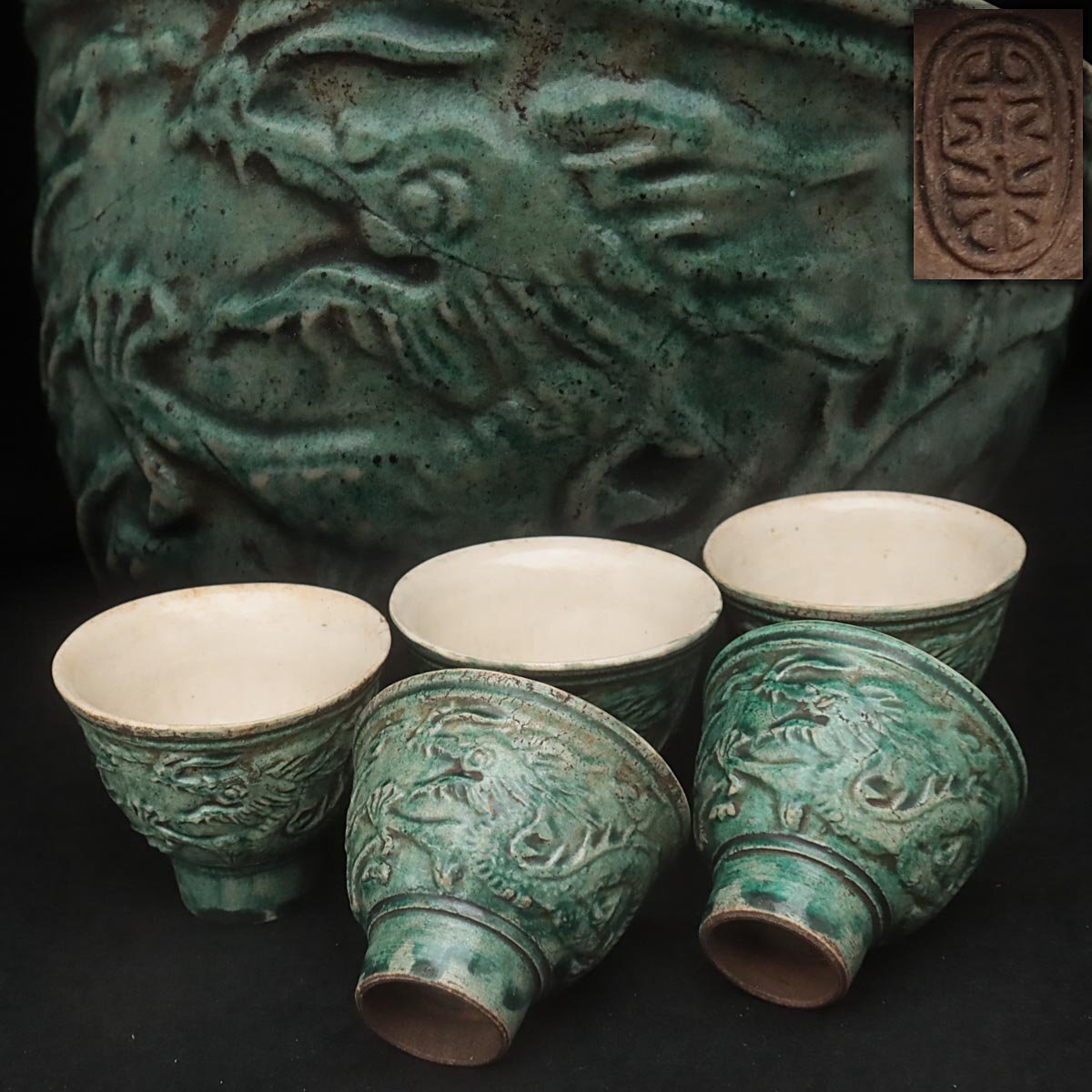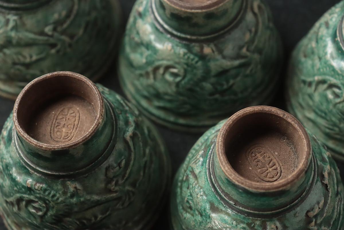 ◆ 時代【名工 青木木米 造】緑釉 陽刻 珠追龍図 茶碗・煎茶碗 五客・茶杯 茶具 茶器 煎茶道具 古美術 ◆