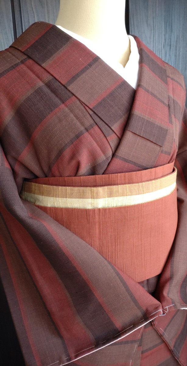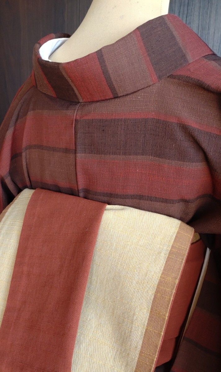 ●●夜桜●●袷お着物●正絹●越後民藝紬★お洒落横縞●京袋帯帯★麻×絹★リバーシブル帯★節織は感謝としてお付けしてます●No415