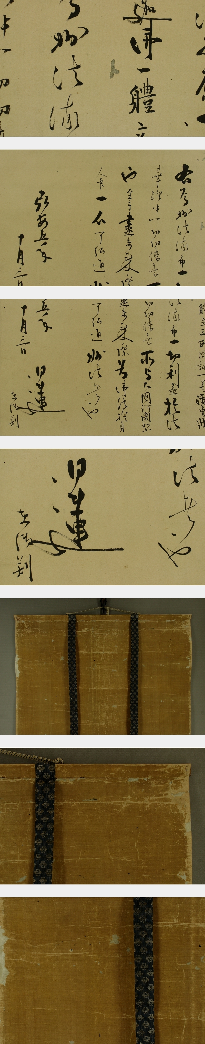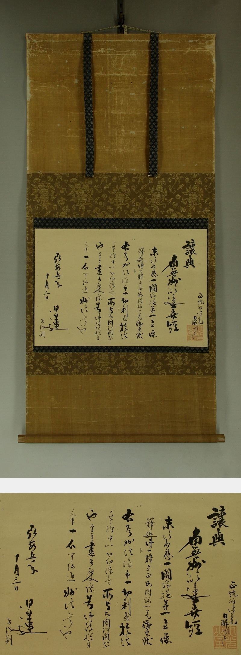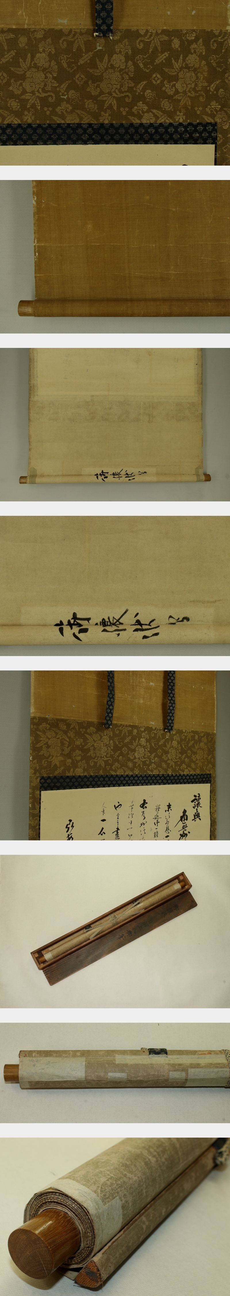日解上人 にちげじょうにん 江戸前期の日蓮宗の僧。京都生。本国寺二十九世。 本国寺の隆盛に多大な貢献があった。江戸にも遊説。立本寺などの住持も務める。 安永4年(1775)寂、82才。 本紙は、染み、汚れ、折れ、皺、虫食いがあります。 表装は、染み、汚れ、強い折れ、皺、虫食い、破れ、ほつれ、生地剥れ、 擦れ、ヤケ、修理痕があります。 作品 横約53cm×縦約36cm 表装 横約58cm×縦約125cm |