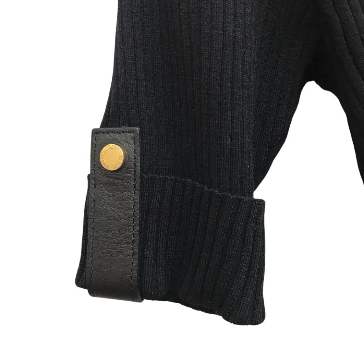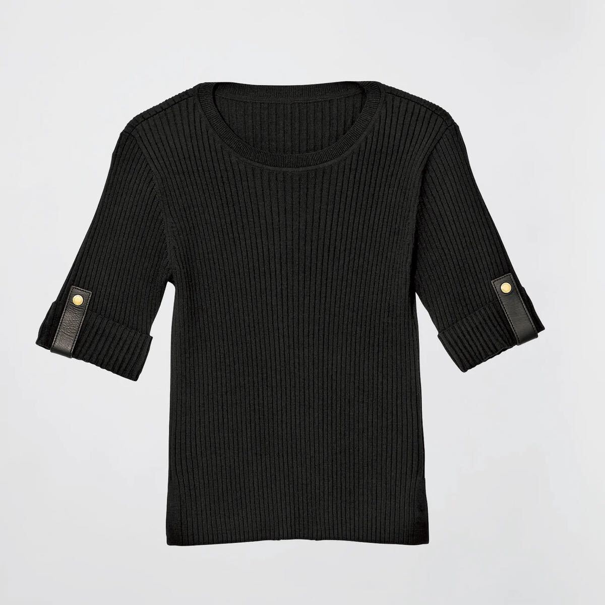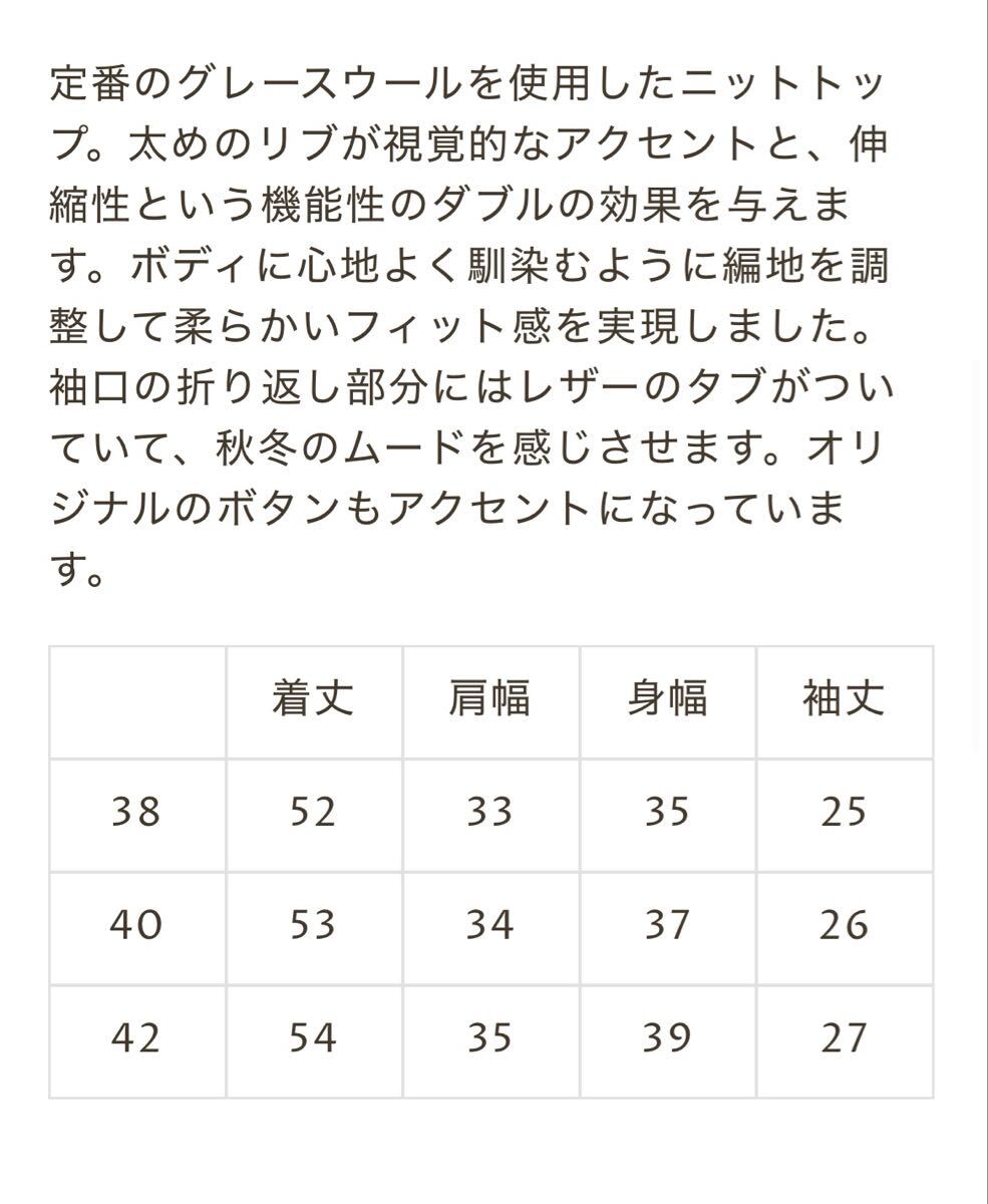 定番のグレースウールを使用したニットトップ。太めのリブが視覚的なアクセントと、伸縮性という機能性のダブルの効果を与えます。ボディに心地よく馴染むように編地を調整して柔らかいフィット感を実現しました。袖口の折り返し部分にはレザーのタブがついていて、秋冬のムードを感じさせます。オリジナルのボタンもアクセントになっています。