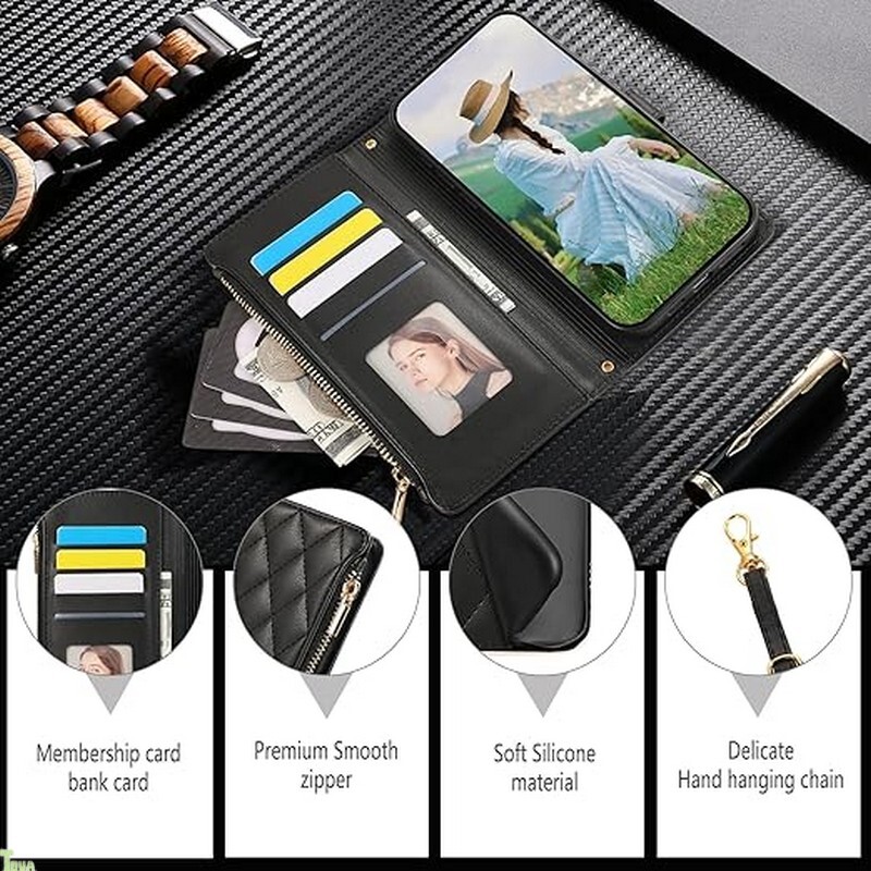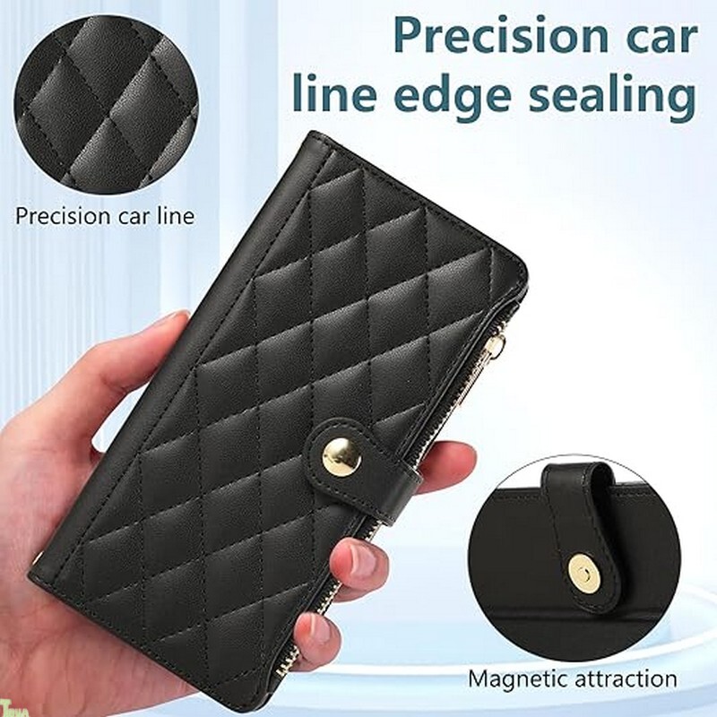 財布型の外観は高級PUレザーとダイアチェック柄刺繍の組み合わせでデザインされます。