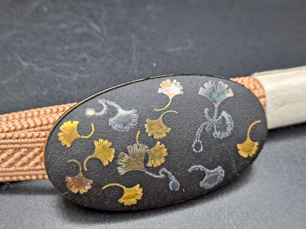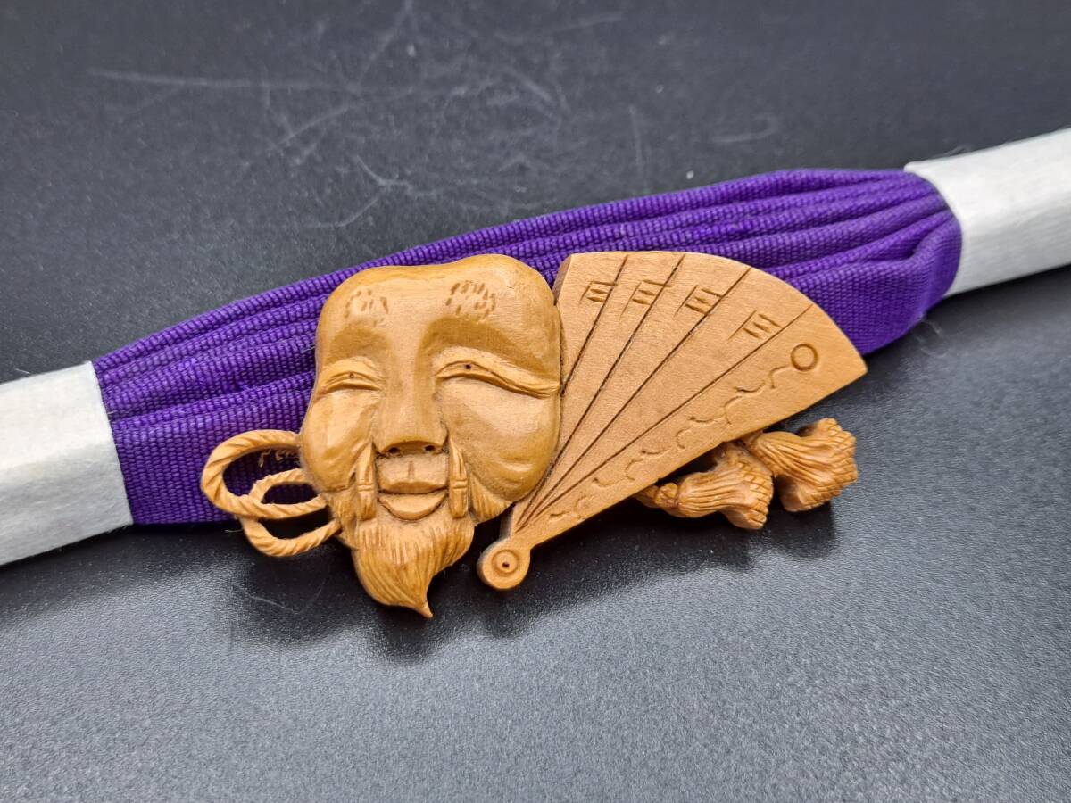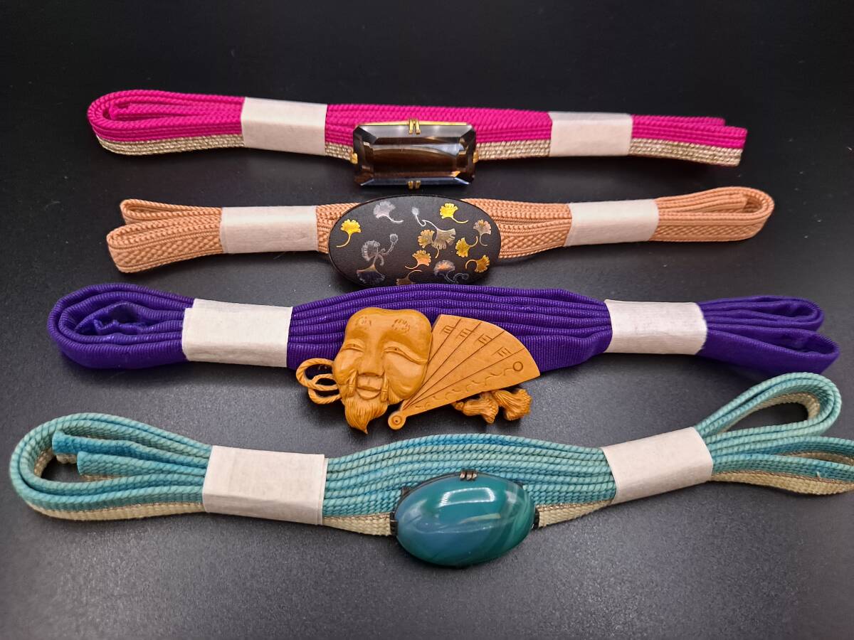 | 【12】アンティーク・ヴィンテージ黒曜石?「翁と扇」意匠黄楊・「銀杏」象嵌・青瑪瑙帯留め 帯締め三分紐付4点 | ||||