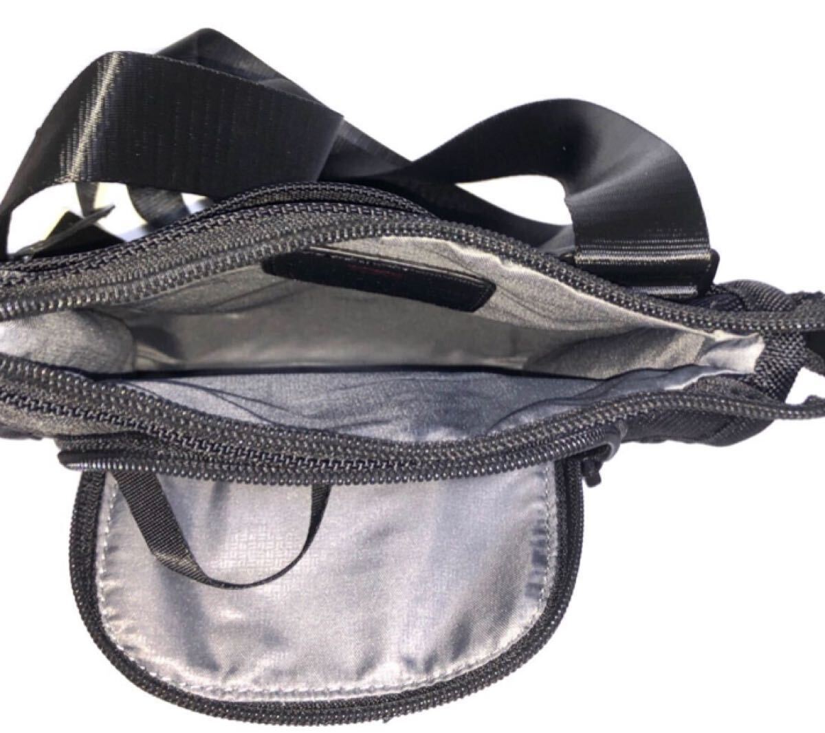 ファスナーで開閉するメインコンパートメント・フロントのU字型ポケット・背面のオープンポケット・ショルダーストラップ(長さ調節可能)