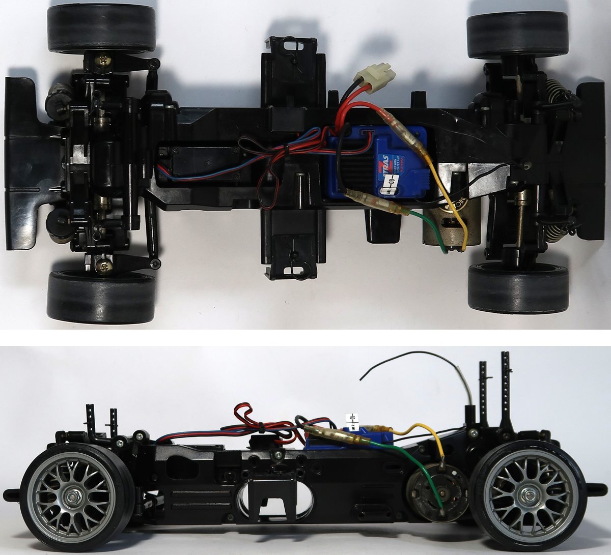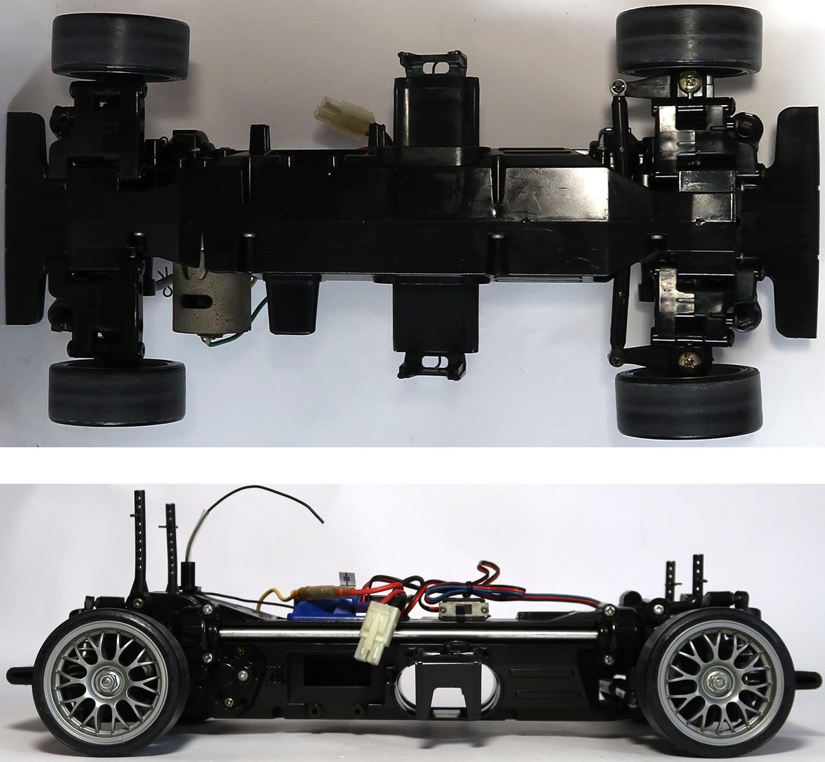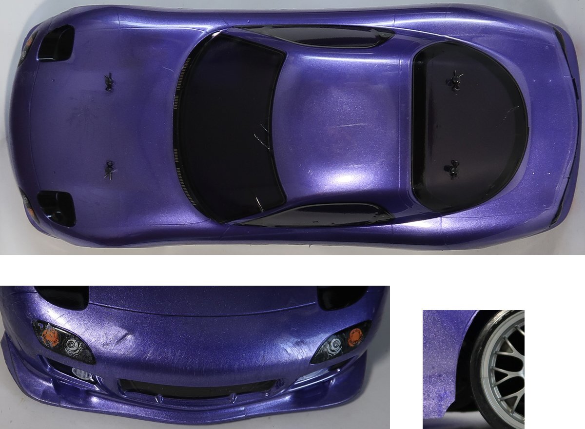 出品は画像の物のが全てです。他に必要なものはご自分でご用意ください。付属のバッテリーは問題なく動作しておりますが、バッテリーは消耗品ですのでいかなる状態であったとしてもノークレームです。状態は使用品ですので擦り傷や汚れが有ります。ボディは傷、若干切れている箇所や凹みがあります。タイヤはドリフト用のタイヤですが、デフなどは固定されてません。シャーシは擦れや汚れはあります。リア側片方のボディ留めの付け根が割れて、ネジを外せば取れてしまいます。ネジを締め付けることで一応留まっています。ご自分で接着するなり誤対処ください。私が確認する限りはその他にひどい破損は確認出来ませんでした。バッテリーを充電してテストしました。操作はできましたし、動作はしました。その他に多少なりともさらなるメンテナンスは必要かと思います。分かる事は以上です。お取引後は一切のサポートはしておりません。また必要なパーツはお取り引き後にご自分でお調べください。お取り引き後に説明以外の不足品や説明以外の破損や故障が有ったとしても返品は出来ませんしクレームもお受けできません。