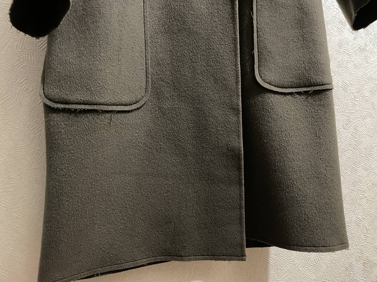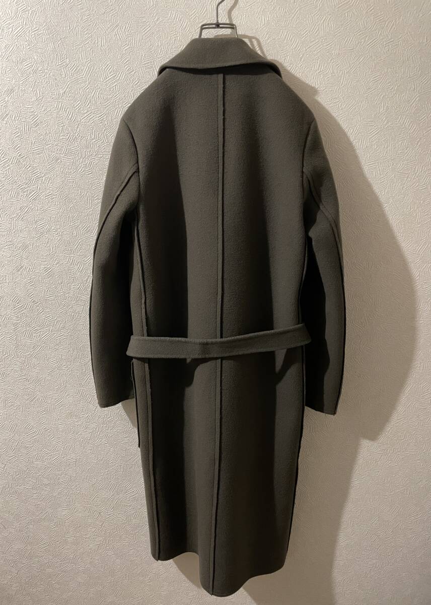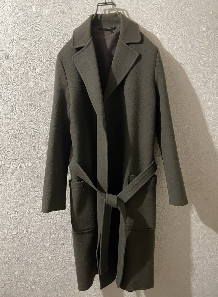 滑らかなカシミア混紡ウールボディに、ボタンのないオープンフロント、ウエストベルトが目を引くクールなデザイン、