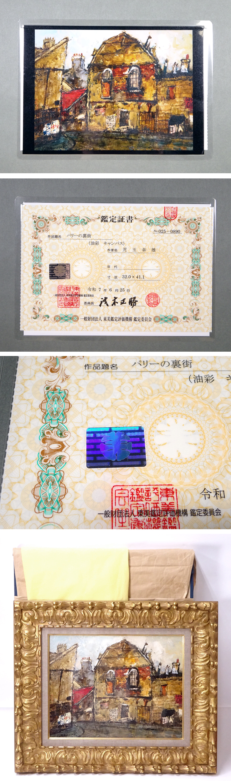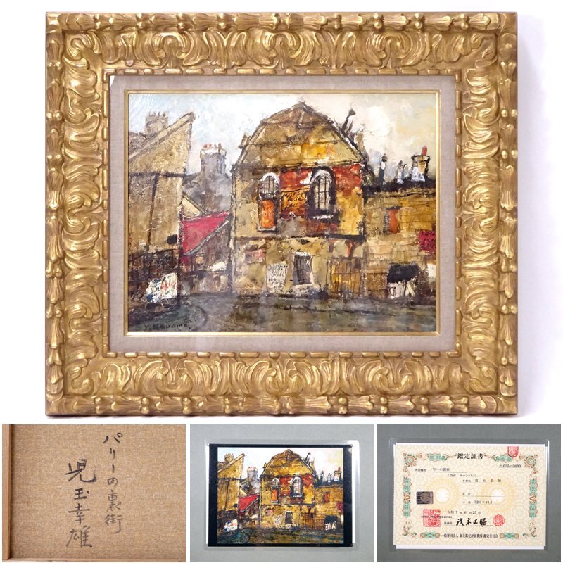 全関西美術展、二科展入賞などで才能を示し、戦後は二紀会の創立会員として活躍。1957年に初渡欧した後はヨーロッパの下町風景、庶民の日常生活を主に表現し続け絶大な支持、人気を博した【児玉幸雄】(1916-1992)真筆。     児玉幸雄らしい力強く重厚なタッチで描かれた風景画『パリーの裏街』(油彩F6号)です。     非常に人気の高いパリの風景作品で、パリの街角がダイナミックな筆致で色彩鮮やかに描き出された秀作です。     キャンバス裏面に直筆サインあり。     前面アクリル板額装。     なお、本作品には、所定鑑定機関である東京美術倶楽部鑑定委員会から令和7年6月25日に発行されたばかりの鑑定証書が付属致します。     タトウ、保護袋付き。