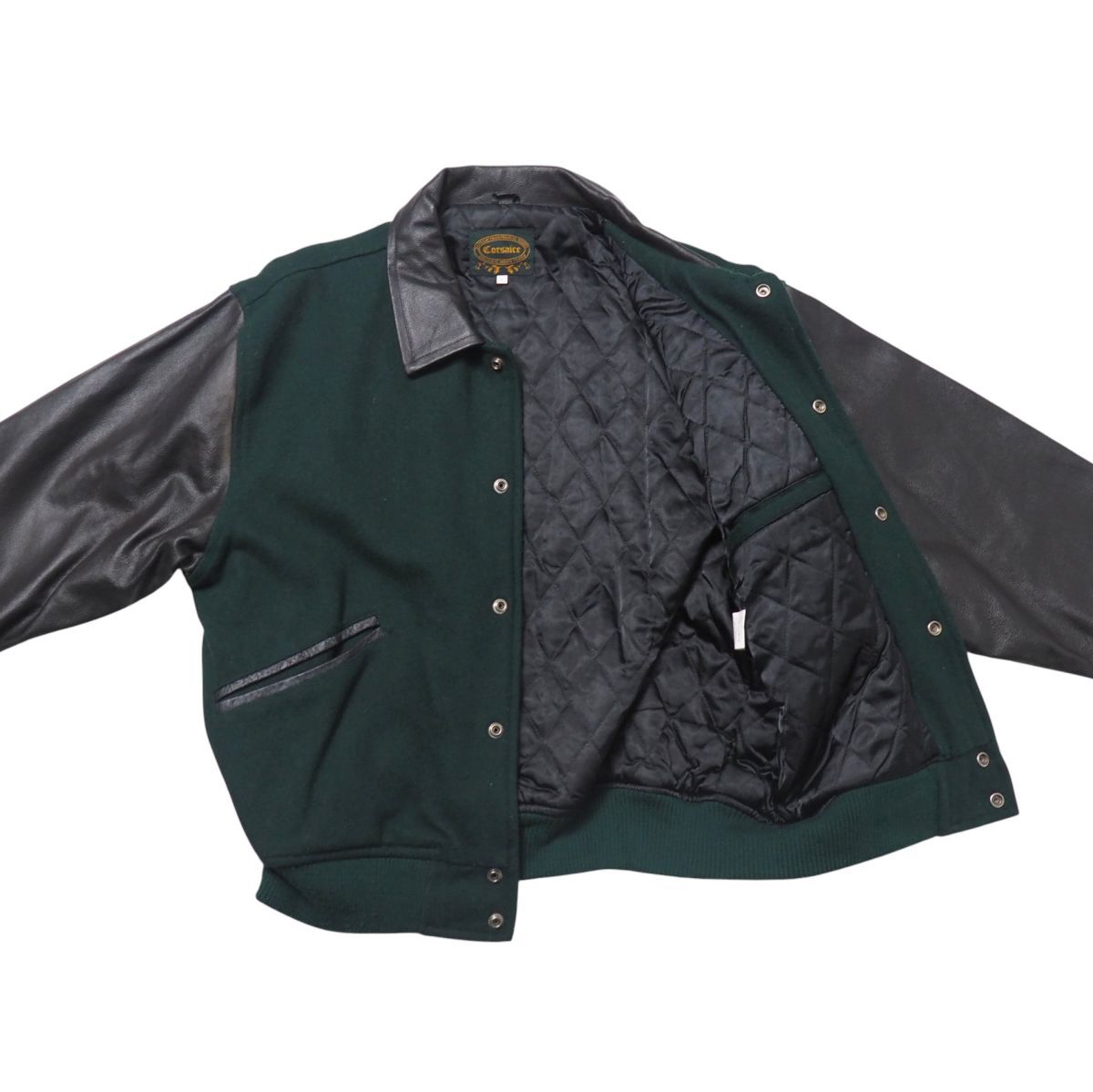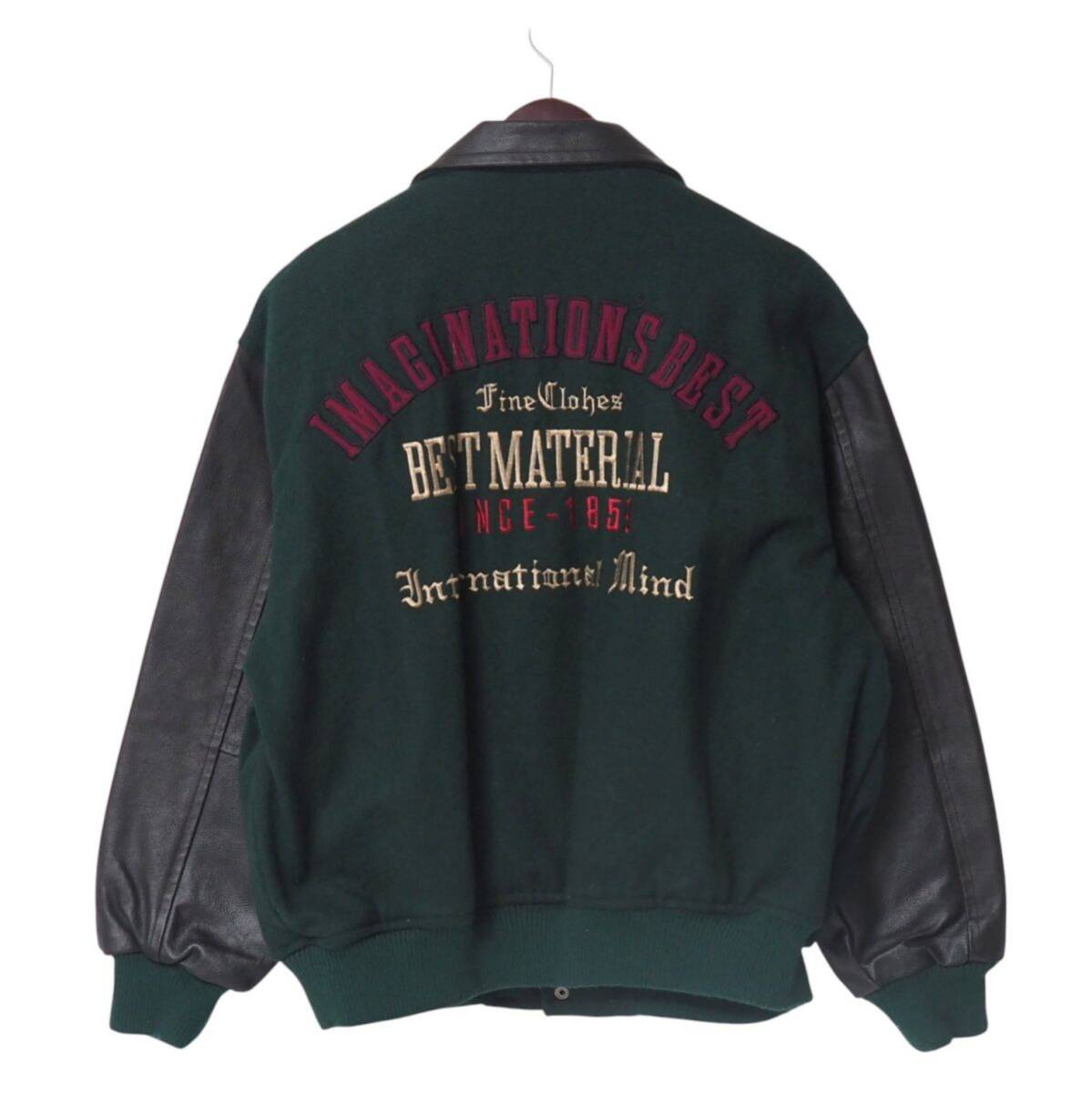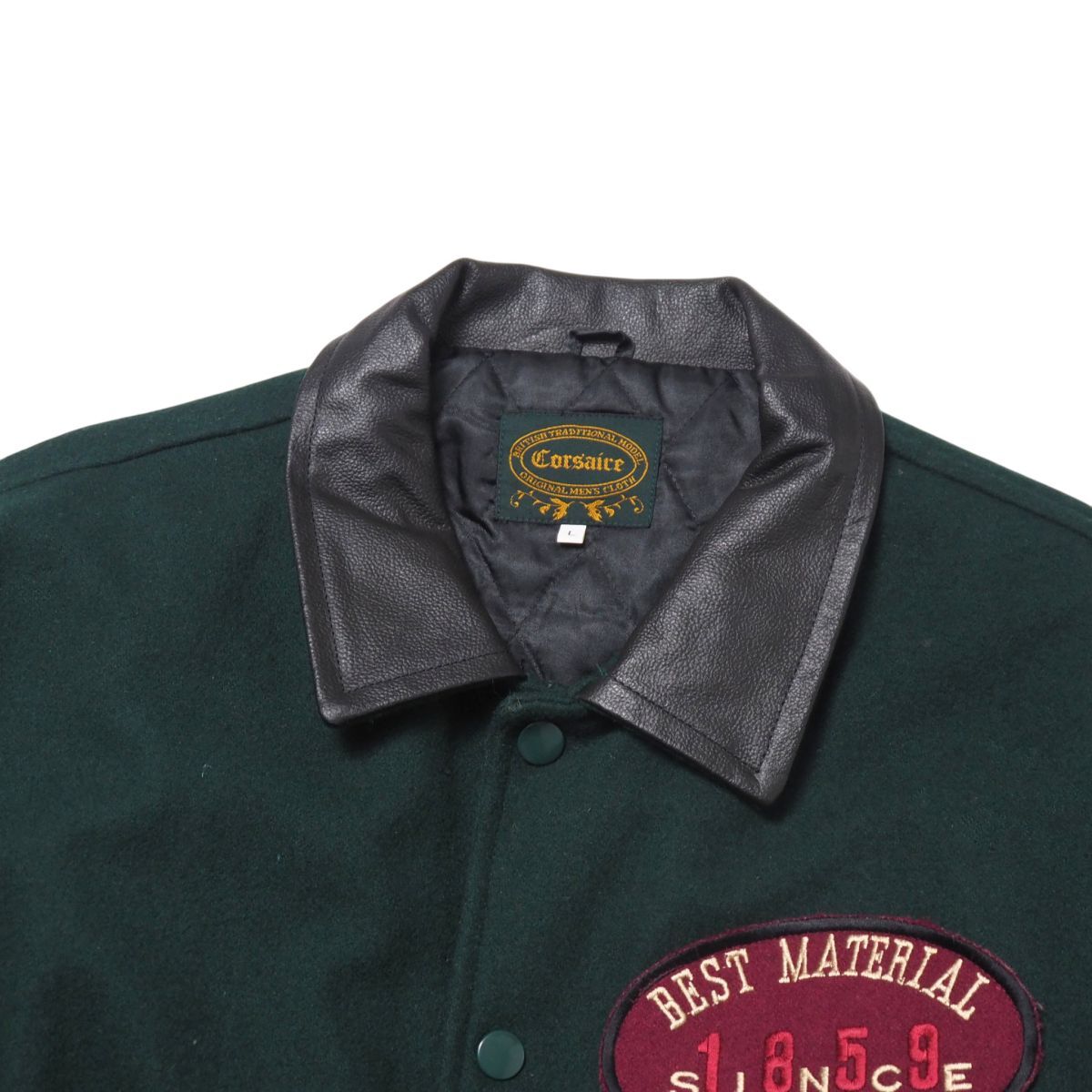 TJ4829▽Corsaire メンズL ウール×レザー ワッペン 刺繍 スタジアムジャンバー ブルゾン ジャケット グリーン×ブラック系 | |||