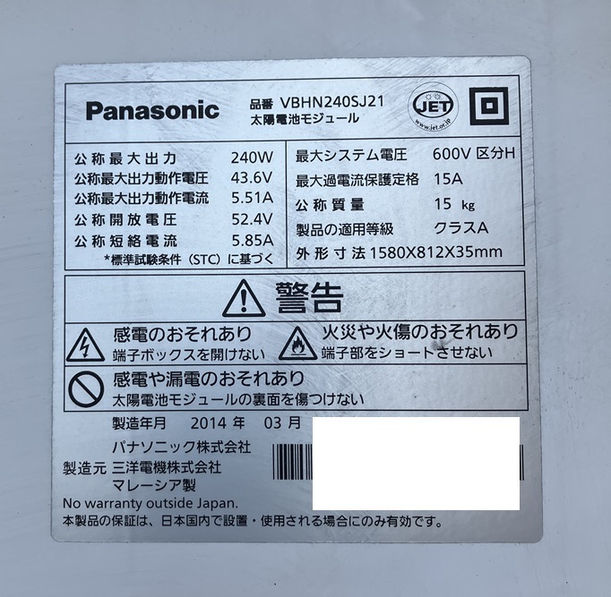 ■仕様■ ◇メーカー:PANASAONIC ◇モデル:VBHN240SJ21 ◇最大出力:240W 開放電圧:52.40V 短絡電流:5.85A 動作電圧:43.60V 動作電流:5.51A ◇外形寸法:約812×1,580×35mm ◇重量:約15.0kg ◇セルのタイプ:単結晶 ●◎商品の状態◎● 中古品です。 中古品が故の傷や汚れ、経年劣化がございます。 簡単な製品チェック・動作確認済です。 電圧、抵抗値、いずれも正常数値でした。 ※こちらは一般家庭や発電所で設置、使用されていたものです。 特筆すべきダメージが認められた場合には、画像を掲載いたします。 スネイルトレイルを含め軽微なものは、一般的な中古品の状態としております。 |