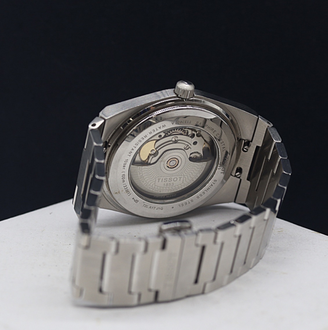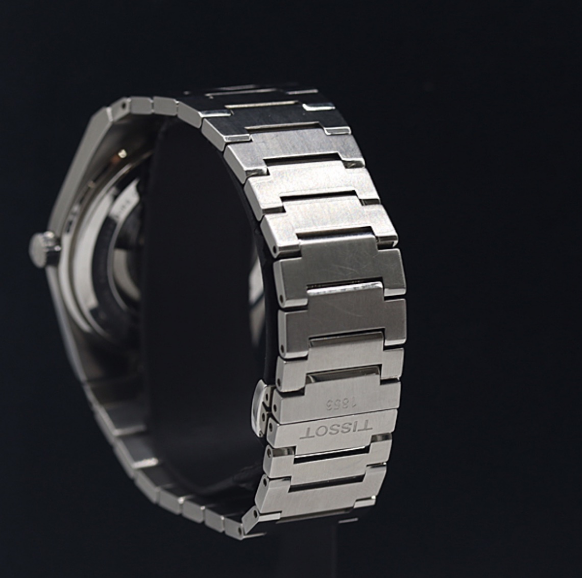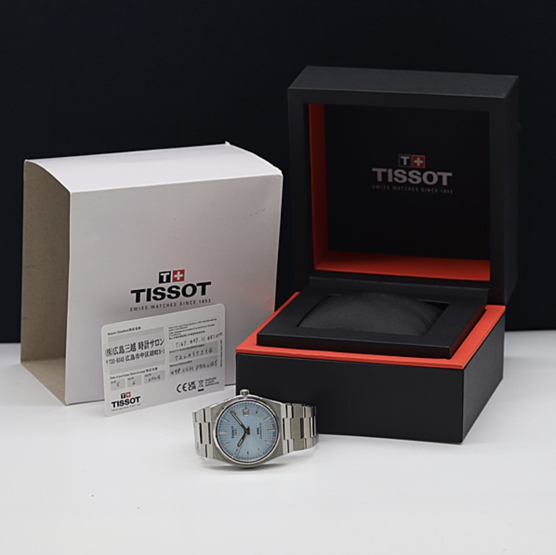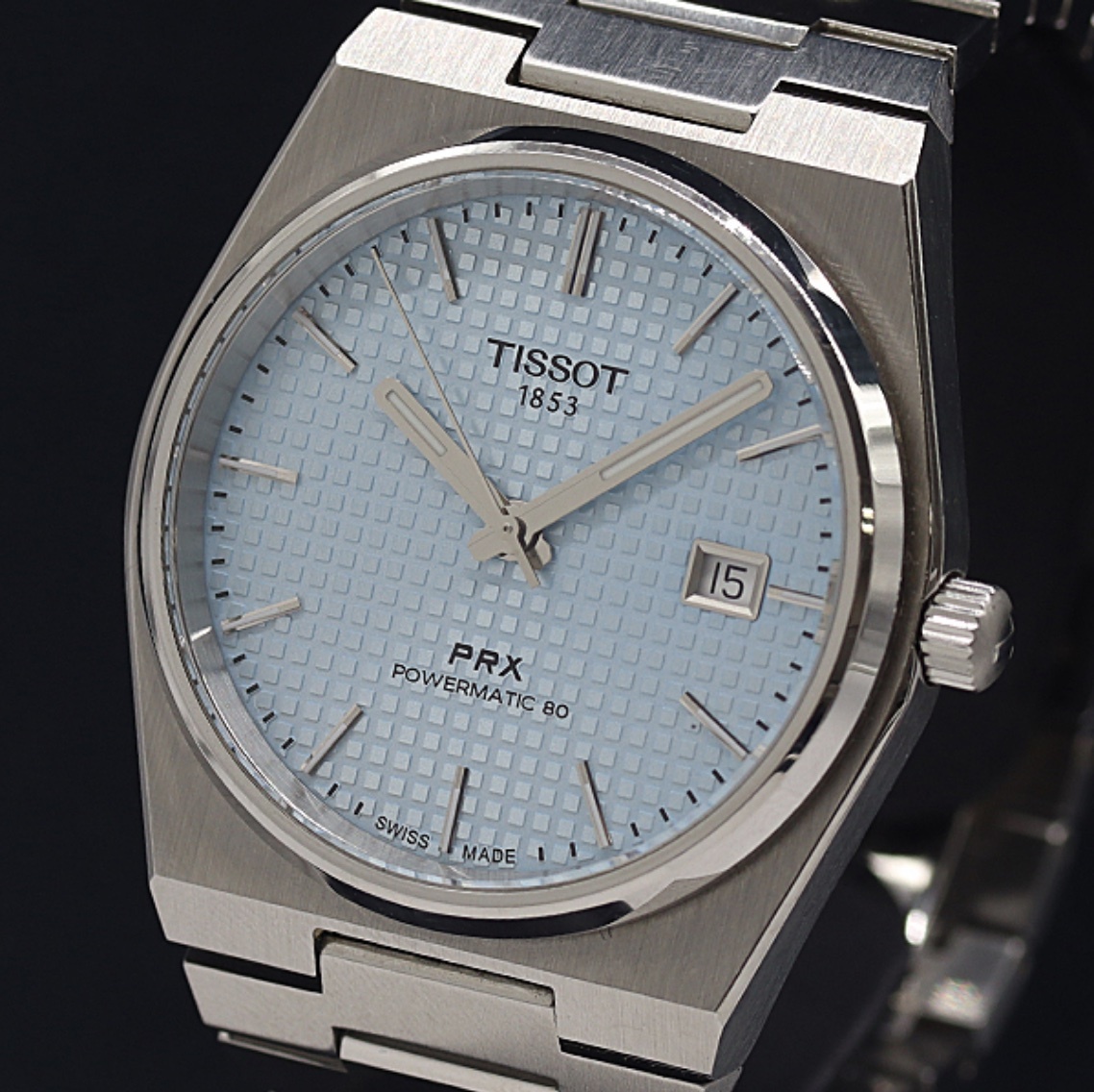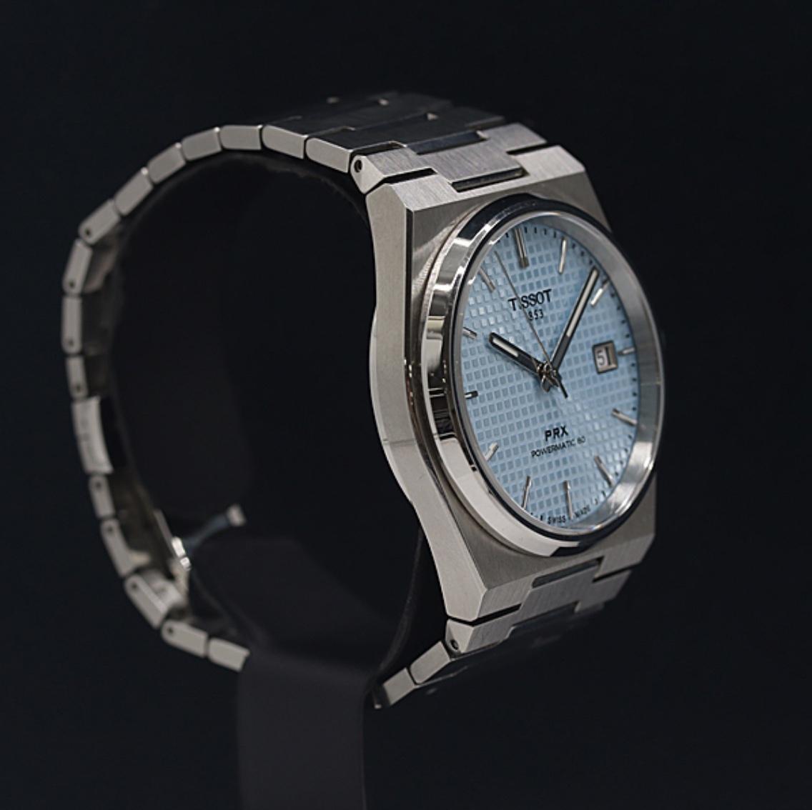 TISSOTの人気モデル「PRX」のライトブルー文字盤仕様です。さわやかで上品なカラーリングが魅力。