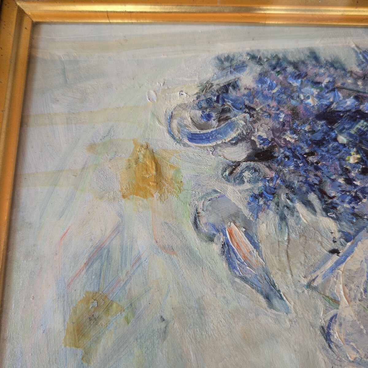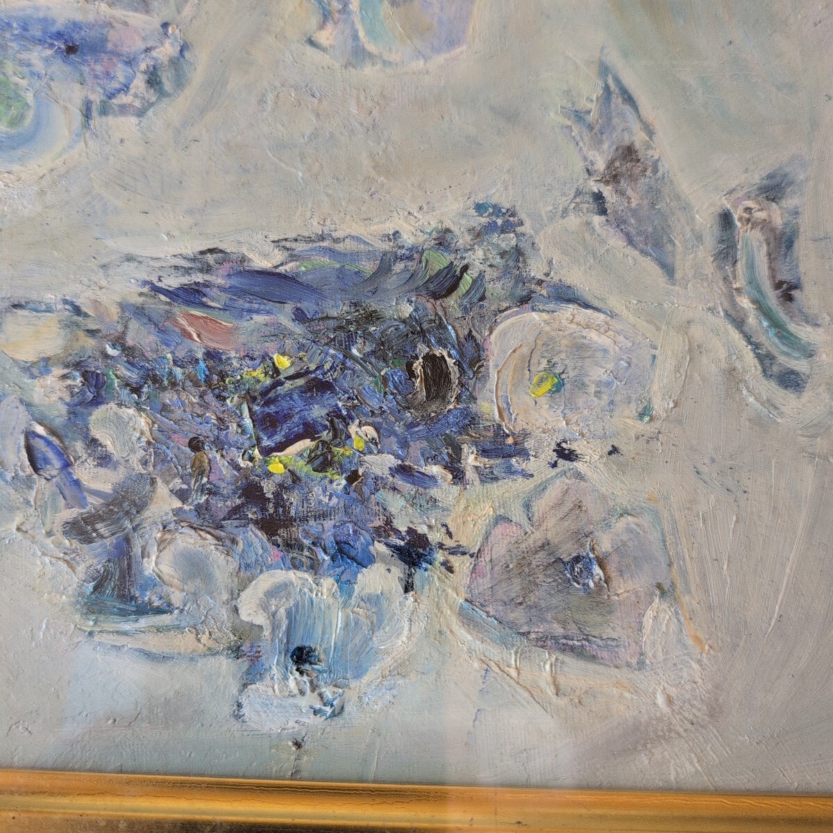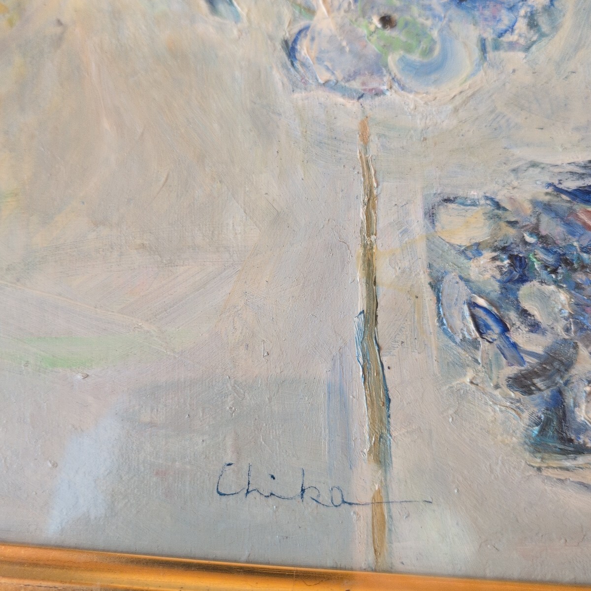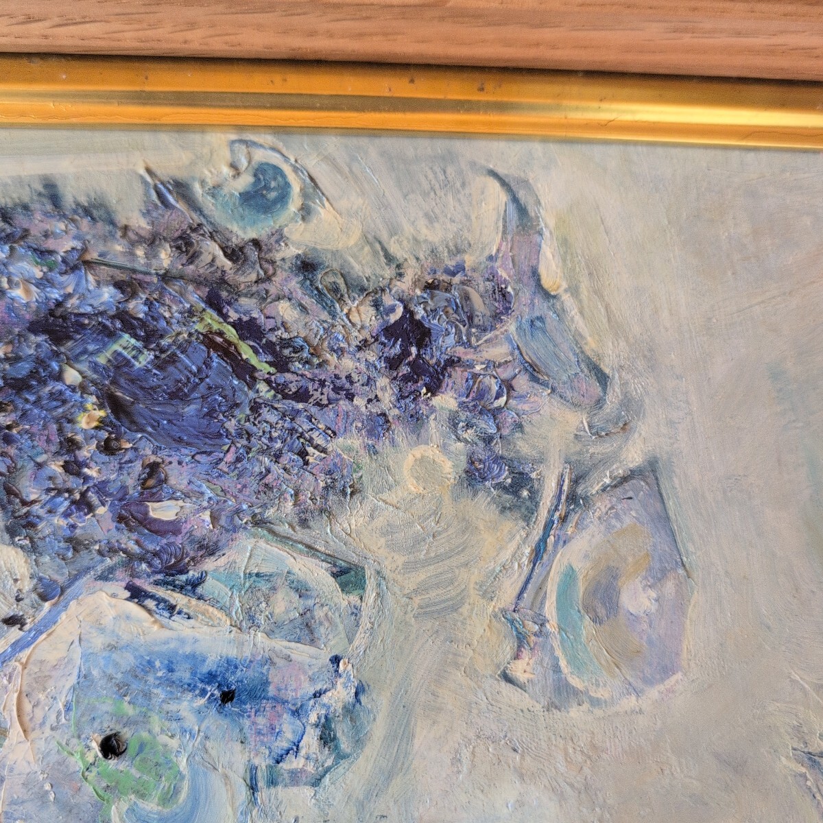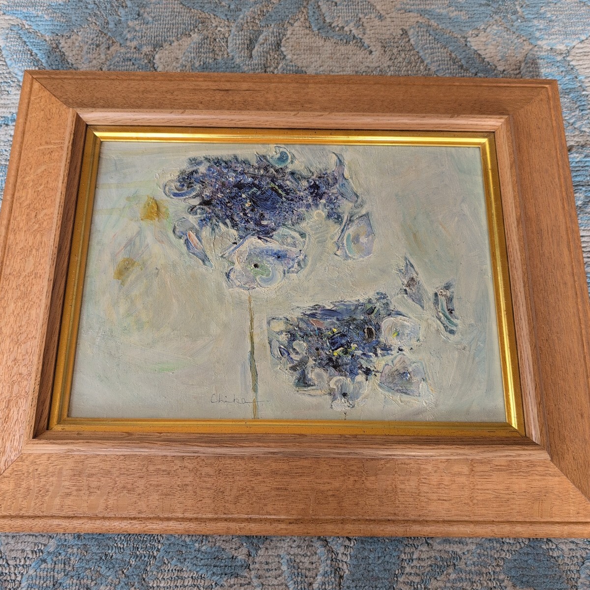 中島千香子のあじさいです。油彩画。額入れて縦39cm×横48.5cm。ギャラリー安里から購入した模様です。