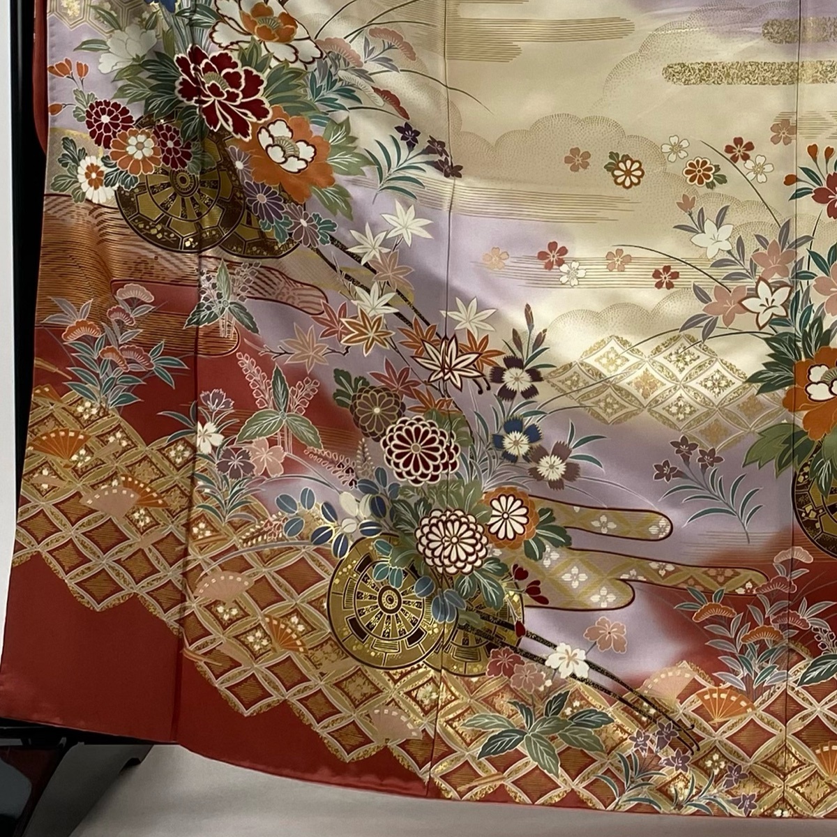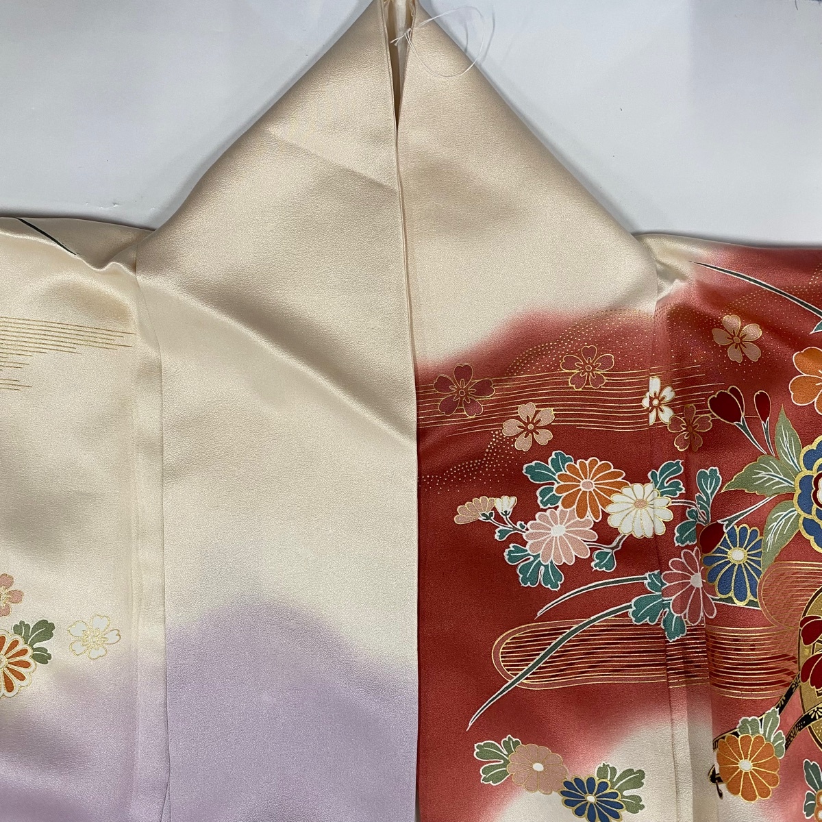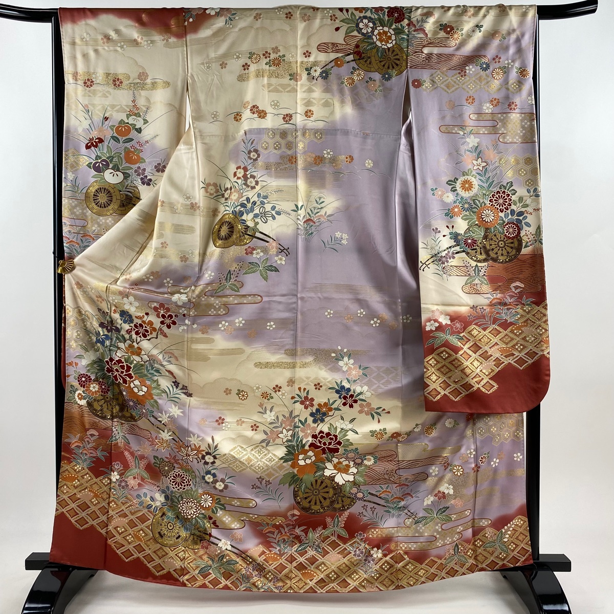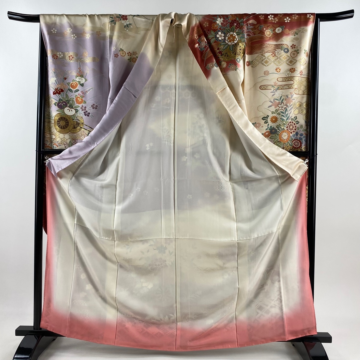 | 振袖 秀品 落款 花車 秋草 金彩 染め分け ベージュ 袷 身丈167 裄丈66 M 正絹 【中古】 |