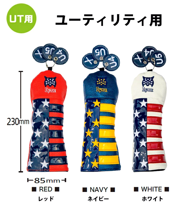 【商品特徴】 アメリカ国旗モチーフの星、ストライプを使用したデザインになっています。 高品質エナメルを使用し、ロゴマークやデザインにこだわった3色(レッド・ネイビー・ホワイト)を展開。 ■従来のロゴマークをアメリカンテイストにした存在感のあるロゴマーク ■同デザインウッド用・アイアン用ヘッドカバー・キャディバッグあり(別売り) 表生地は高級感のある合成皮革(PUレザー)なので、耐磨耗性があります。 裏生地は柔らかいボア素材になっていますので、大切なクラブヘッドを傷や汚れから守ります。 伸縮性のあるゴム(エラスティック)が2段階になっているため、ヘッドを差込んでも締め付けがしっかりとしており、 クラブから落ちる心配がありません。 【商品詳細】 ●状態:新品・未使用品 ●素材:PU/ ENAMEL(エナメル) ●タイプ:ユーティリティ用 ●サイズ:230mm×85mm ●カラー:ネイビー ※クラブヘッド形状によって装着できない場合がございます。 ※撮影時の光量の具合や、ご覧いただいております画面環境によりまして、実際の商品と若干色味が違う場合がございます。