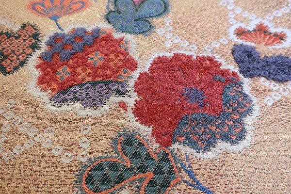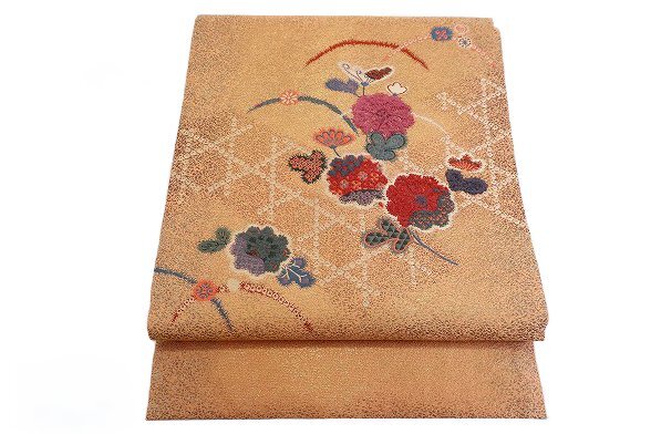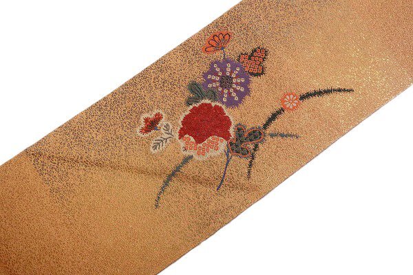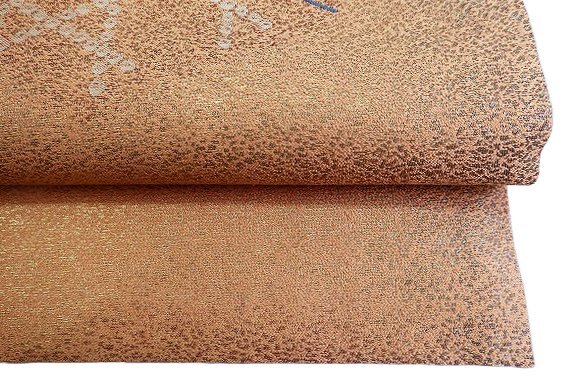 | 名古屋帯 淡い橙 花文 箔糸 長さ3m56cm カジュアル お洒落 普段着 正絹 着物フィ m-8352 |