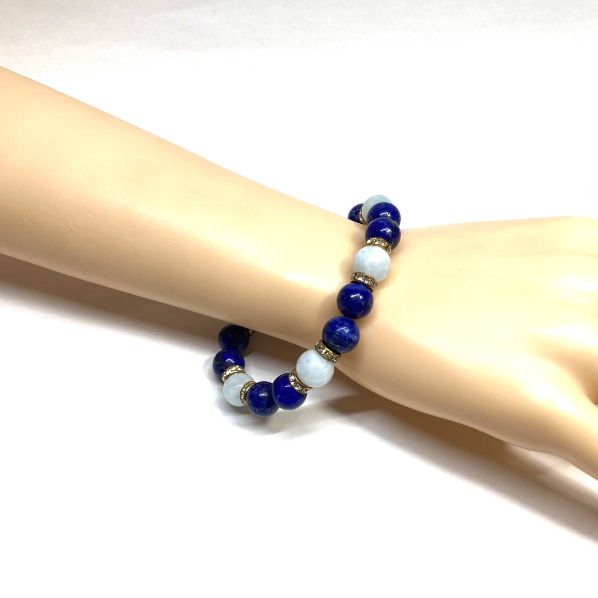 こちらは、ラピスラズリとアクアマリンを組み合わせたパワーストーンブレスレットです。間にはロンデルを挟み高級感あるデザインに仕上げております。石大きさは腕にも馴染みやすいように10mm玉で内径約18cm(伸可能)です。(サイズ変更の場合は取引ナビにてご連絡をお願いします。) 数に限りがございますので気になる方はお早めにどうぞ。