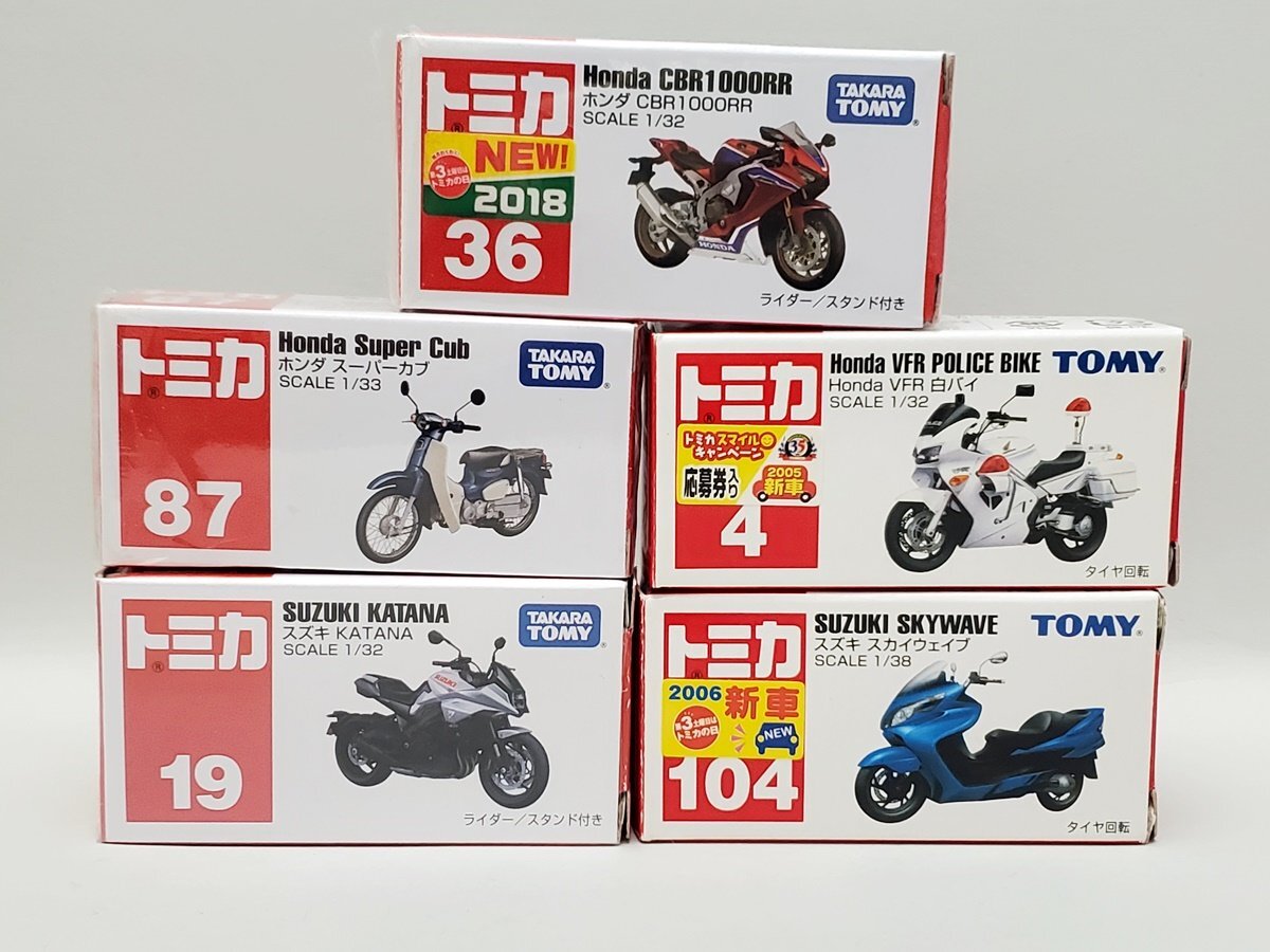 ● TOMICA トミカ No.87 ホンダ スーパーカブ / No.4 ホンダ VFR 白バイ / No.104 スズキ スカイウェイブ など5点セット ●