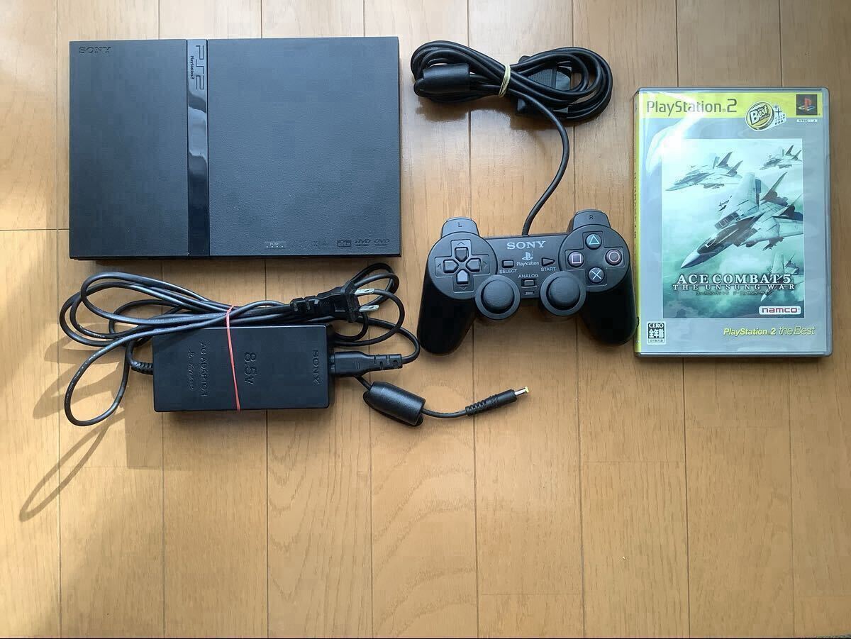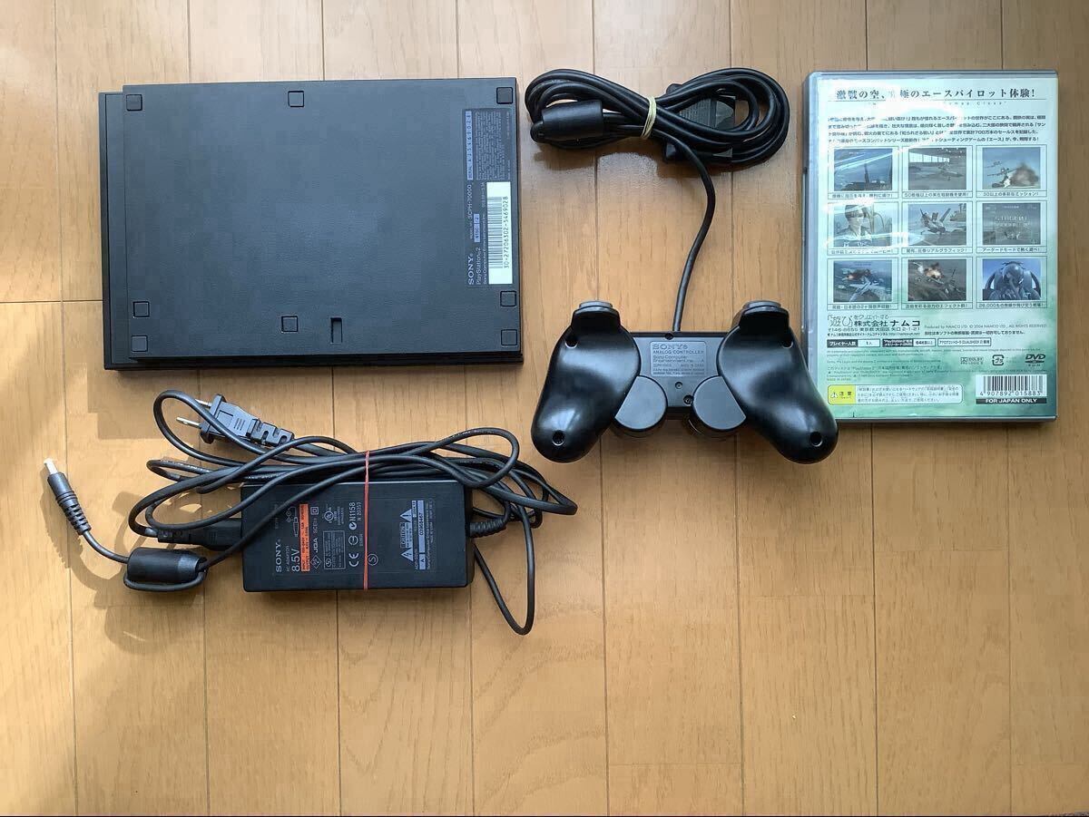 動作品 SONY PS2 薄型 本体、コントローラー、ケーブル類、ソフト1枚 セット販売