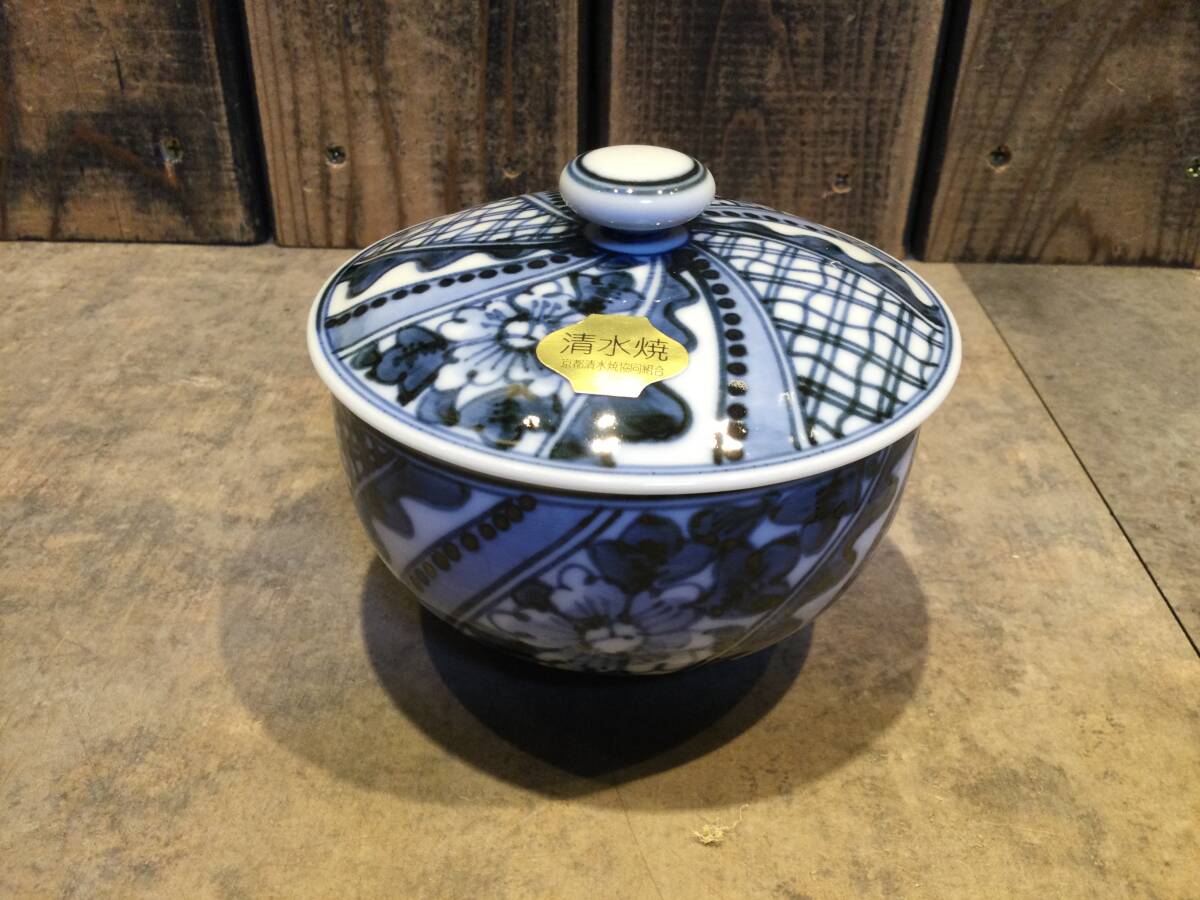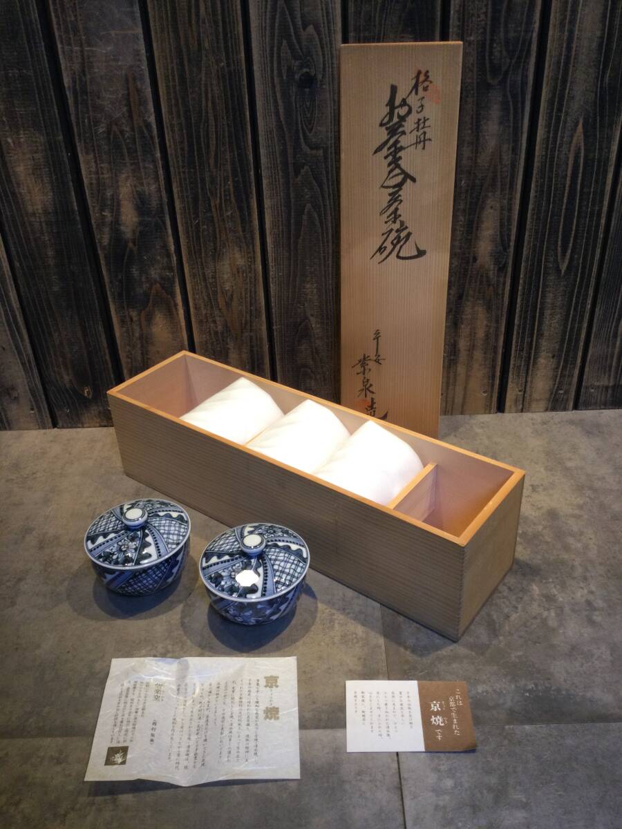 新品・未開封 京焼・清水焼 紫楽窯 西村紫楽 平安 紫泉造 格子牡丹 蓋付 お茶茶碗 5客セット 牡丹 茶器 湯呑 煎茶揃 茶器揃 保管品