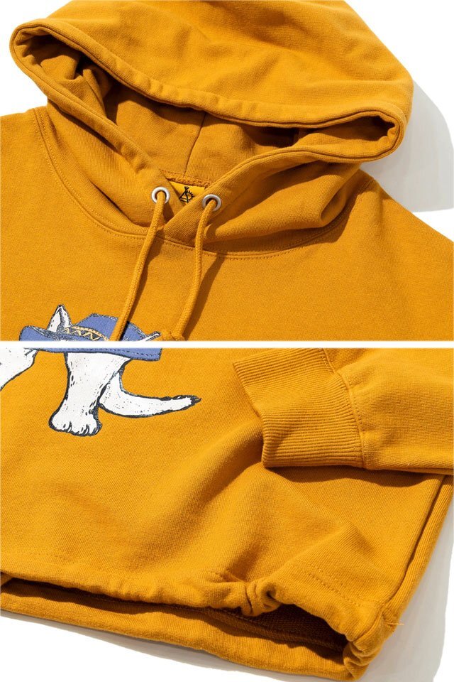 旅行やフェス、キャンプ、サーフィン、サイクリングなど、外遊び好きの仲間が集まってはじめたブランド【go slow caravan】より「空紡糸裏毛 スキレットピザ猫 ヘムスピンドルフーディー(352607)」のご紹介です。 go slow caravanオリジナルで編み立てている空紡糸裏毛シリーズから、人気の「猫」スピンドルフーディーが登場しました! 裾口をスピンドル仕様にしたベーシックシルエットのフーディーです。 リブ裾タイプに比べてインナーに重ねてもゴワつきにくく、絞ることでシルエットのアレンジもお楽しみいただけます。 フロントには、スキレットで焼いたピザを頬張る「キャンパー猫」をプリント。 黒インク部分にはジェルプリントを重ね、立体感のある多色ラバープリントで表現しました。 愛嬌と遊び心を詰め込んだ1枚です。 《空紡糸裏毛/HEAVY WEIGHT》 表は空紡糸らしいガシッとした肌触りでありながら、裏のパイル面には太い裏糸を使用しているため、空気を多く含みフワッと柔らかい着心地を実現しました。 使い込むほどに風合いの増す生地。 クラシック感のある長めのリブや3本針で丈夫な縫製など、こだわりのディテールも取り入れた長くご愛用いただけるアイテムです。 | ||||||||||||||||||||