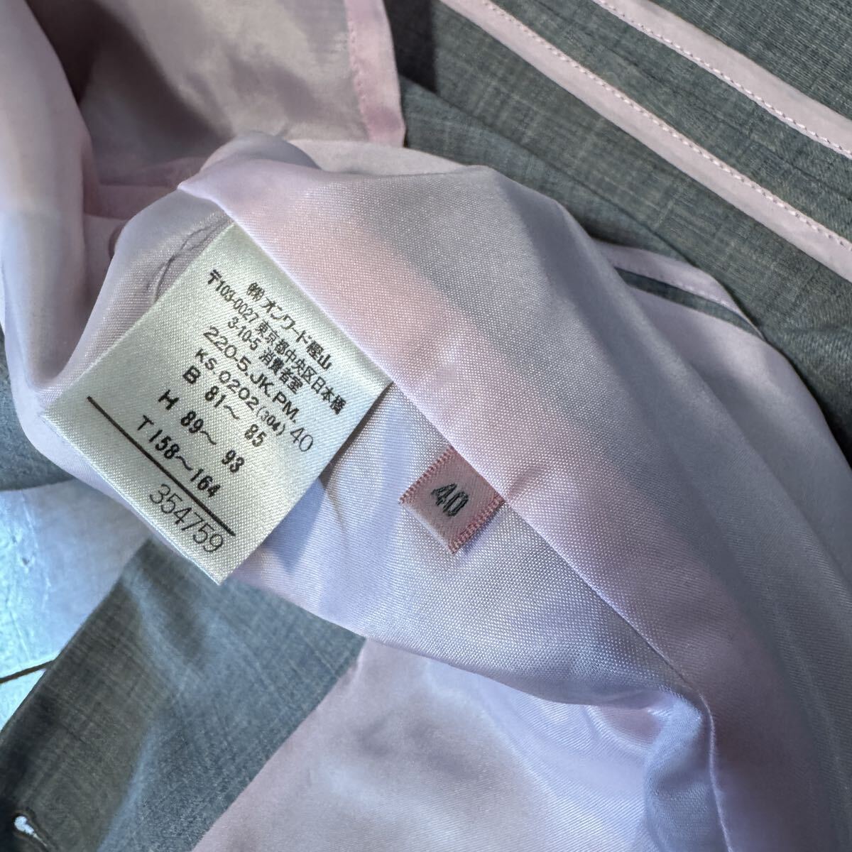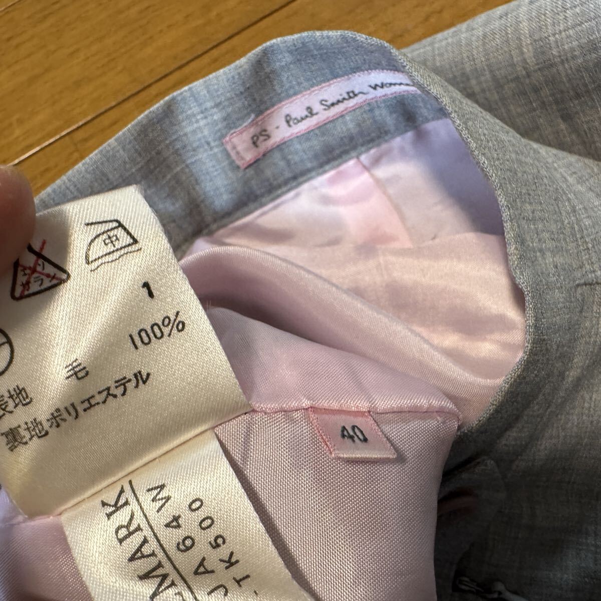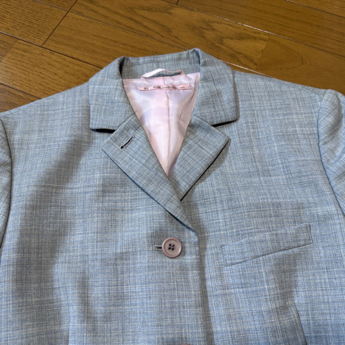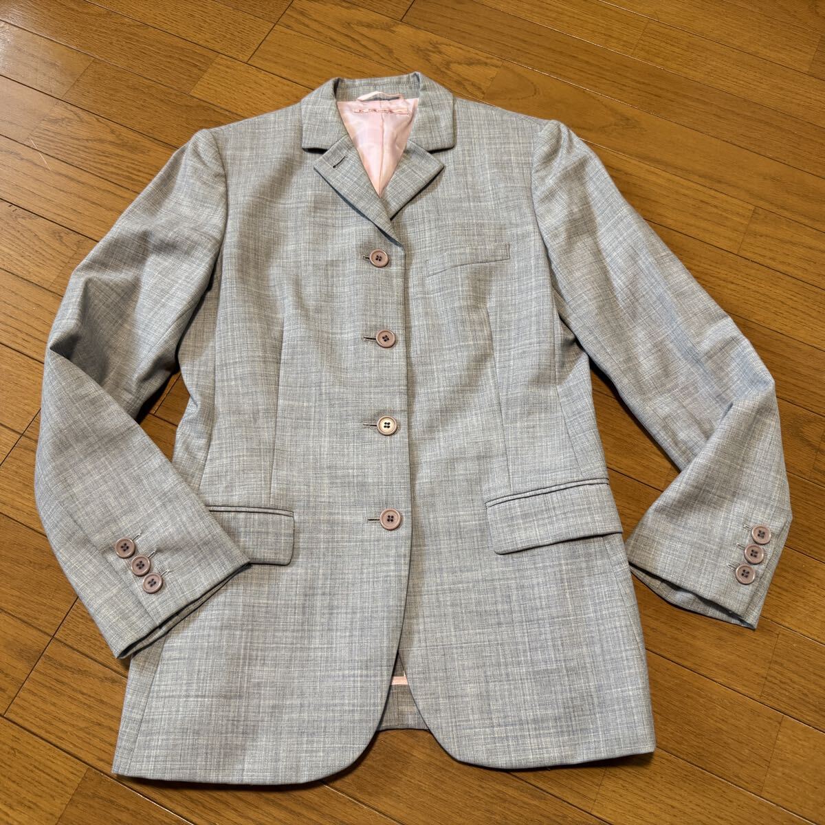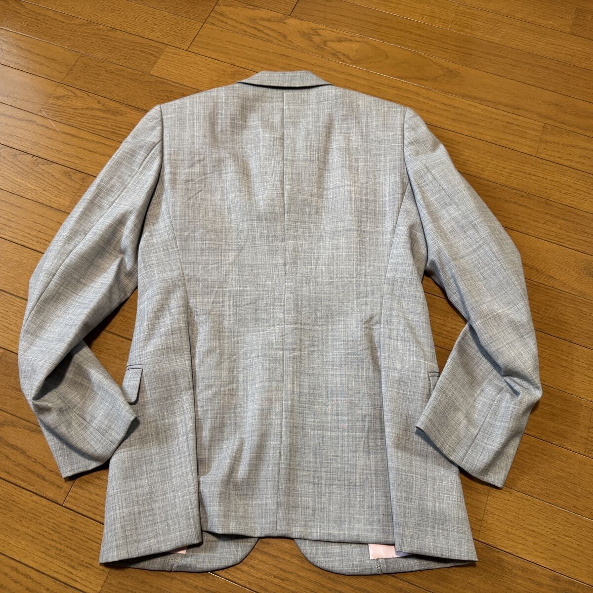 PaulSmithポールスミスのスーツ・セットアップです。薄いグレー地の背抜き仕様で、ピンクの裏地とモーヴピンクのボタンが優しい印象です。家族がフォーマル用に購入し、短時間1回使用しました。クリーニングして保管しておりました。汚れ・傷みはありませんが、USED自宅保管が気になる方はご遠慮ください。