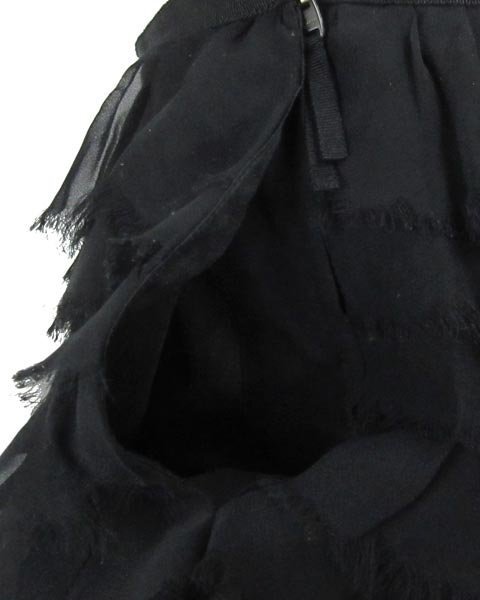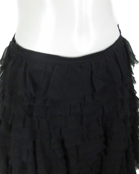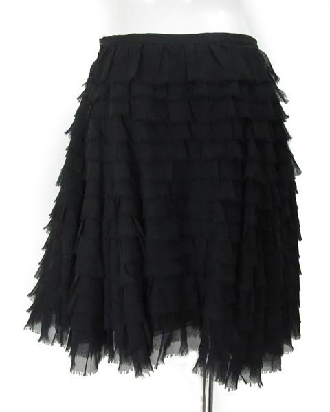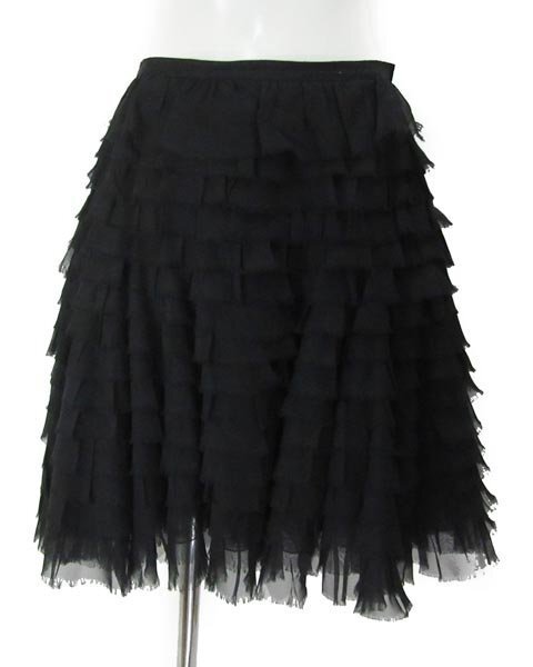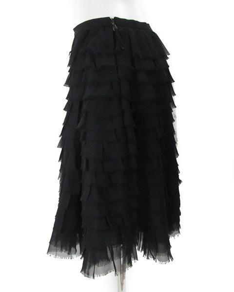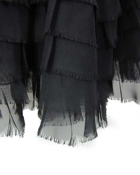 | 贅沢に重ねたシフォンフリルがフェミニンなスカート。コーディネートしやすい黒なので重宝します。華やかな雰囲気があり、お出かけスタイルからちょっとしたパーティーシーンまでお使い頂けます。シフォン素材なので、シーズン問わずお使い頂けます。 |