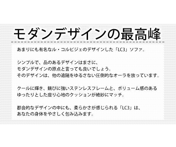 | 商品紹介 | ◆◆LC3◆◆ ■20世紀最も偉大な近代建築の巨匠ル・コルビジェの独創性と革新性が 余すところなく表現されたソファ。 ■落着きと品格のある上質な本革ソファです。 (一部合成皮革を使用しています。) ■座面をしっかりと支えるラバーストラップが絶妙に伸縮し、 さらなる心地良さを生み出します。 ■クッションには、柔らかな羽毛と、適度な弾力のあるポリエステル繊維を バランスよく配合。中心にはフォーム(発泡素材)を挟み込み、 安定感のある快適な座り心地を実現しました。 ■フレームは、高級感溢れる錆びに強いステンレススチールパイプを使用し、 ポリッシュ仕上げを施しました。 ■ボリューム感のあるゆったりとした座り心地です。 ■背がロータイプなので、部屋を広く見せ圧迫感を軽減します。 ■落着いた大人の空間を演出します。 ■材質:本革、一部合成皮革を使用(クッションカバー) 発泡素材、ポリエステル繊維、羽毛(クッション中身) ステンレス(フレーム) ラバー(座面下ストラップ) ■重量:約17kg ■こちらの商品はリプロダクト製品(デザインに対する版権の期限が切れた製品を当社がオリジナルで復刻したもの)です。 |
