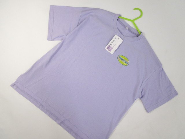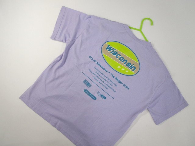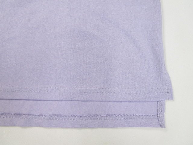 ドロップショルダー 五分袖 ラウンドネック Tシャツ 150 パステルパープル地 イエローグリーン×ベージュ×ブルー系 英字プリント 【メール便可】