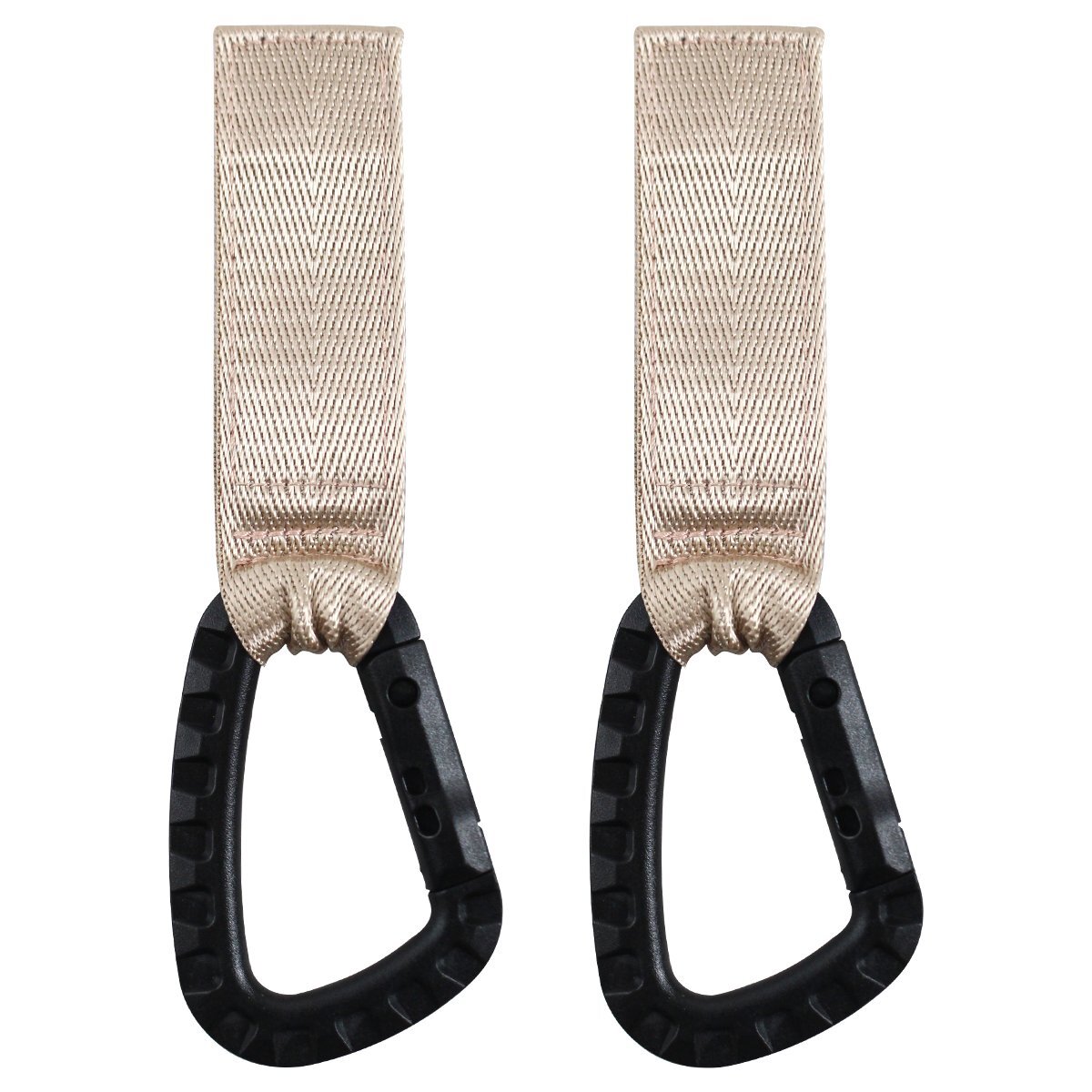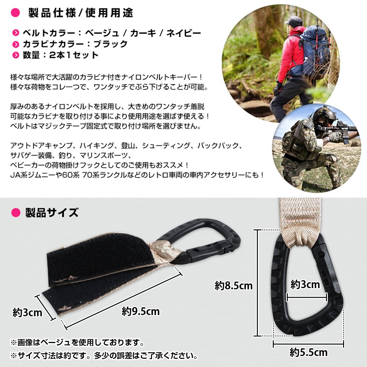 【新品即納】2本set『ベージュ/ブラック』カラビナ ナイロンベルトキーパー マジックテープ固定 登山 釣り 林道 ベビーカー 車内 用途多数
