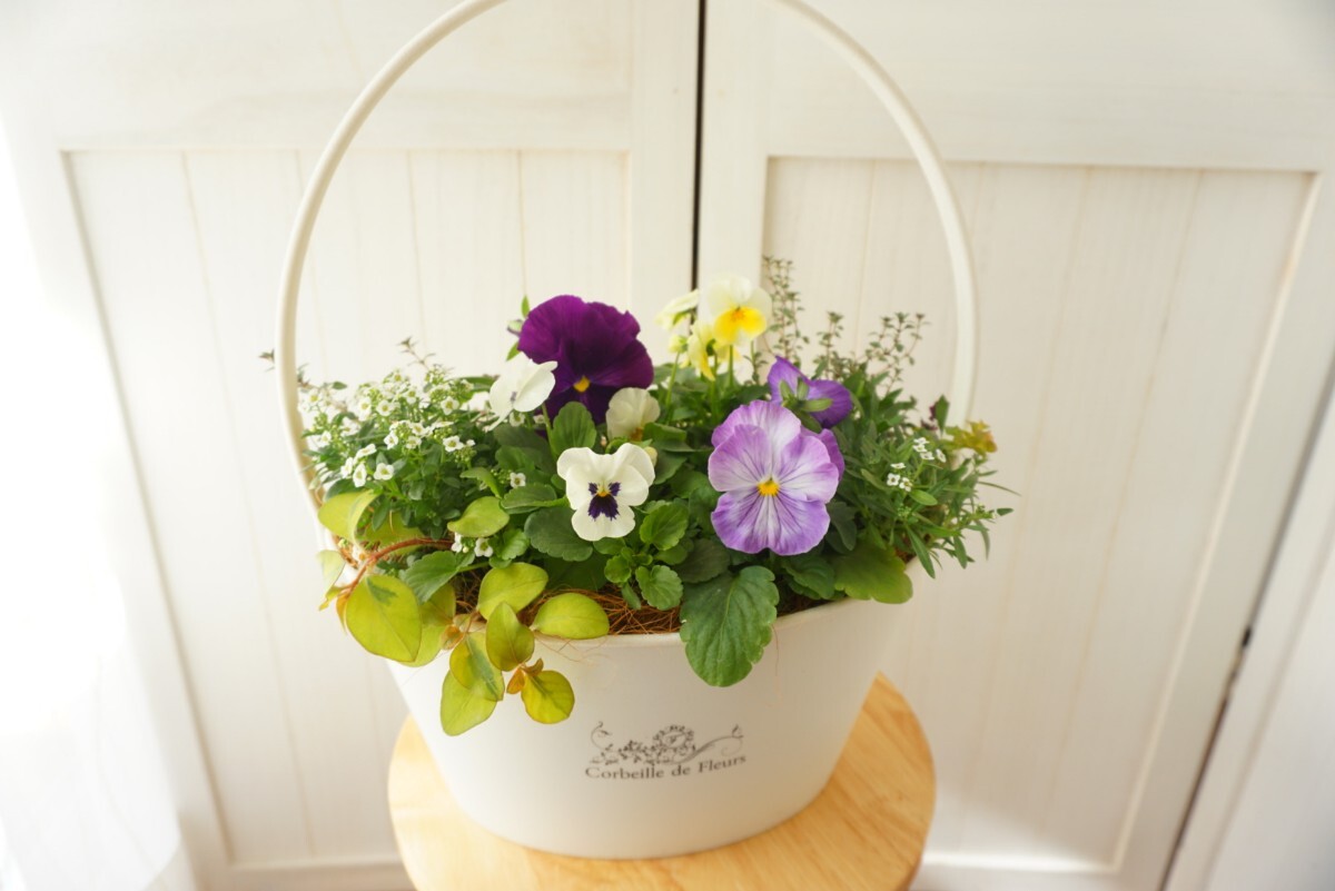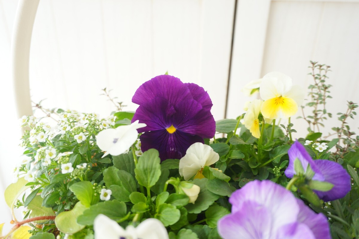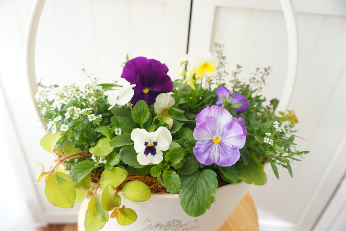 パンジービオラとアリッサムの寄せ植えです(^^)ブルー系のカラーで合わせてみました♪アリッサムのお花も入っていて、お花畑のような寄せ植えになってます(^^)寒さにも強い品種を選んでいるので春まで長く楽しめます♪