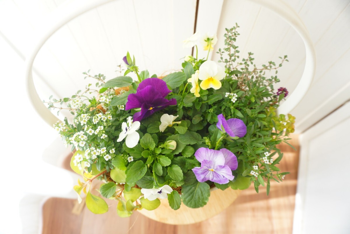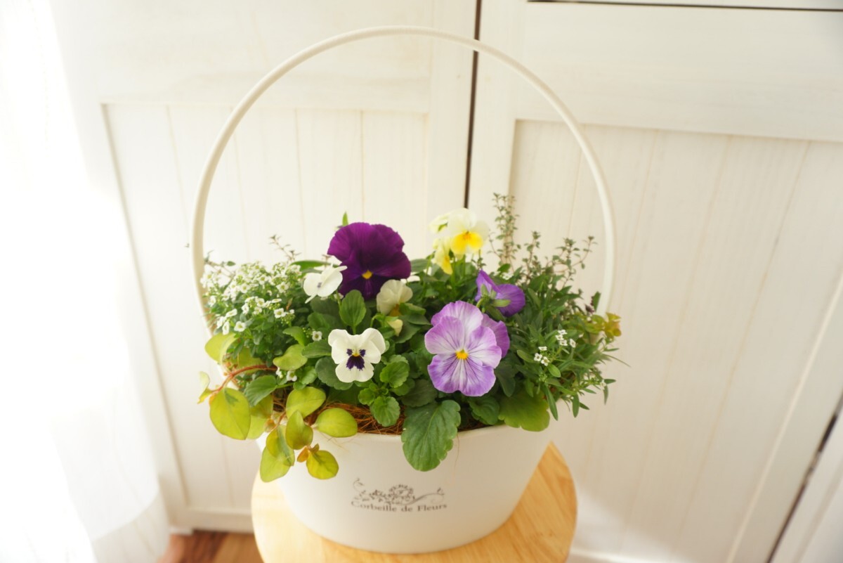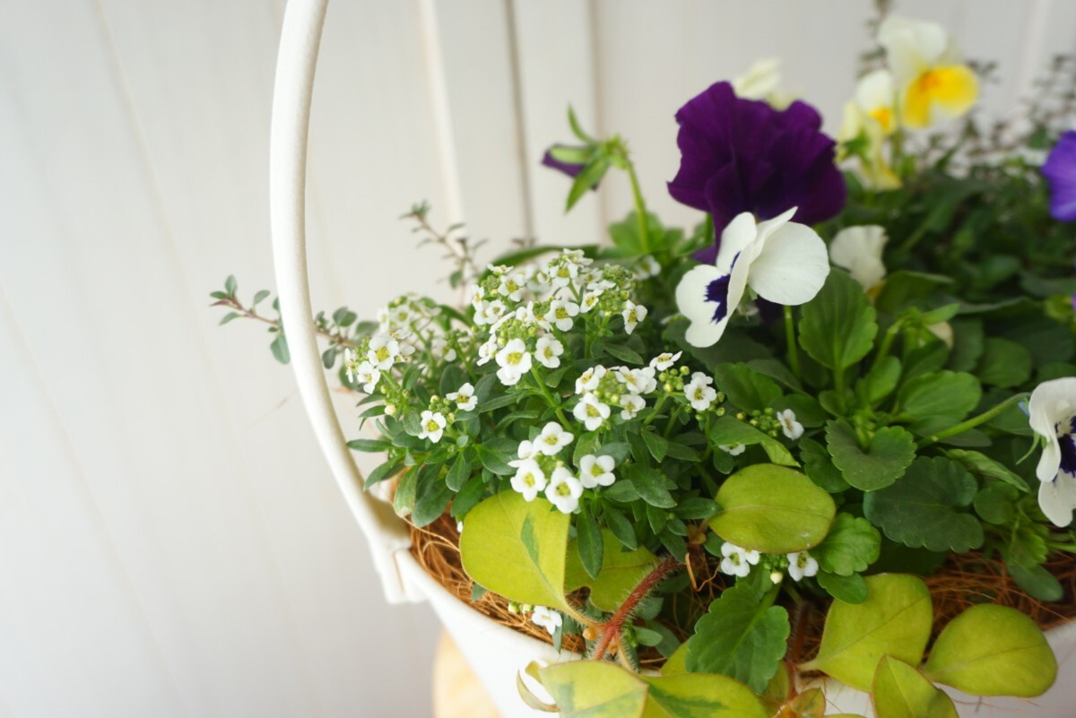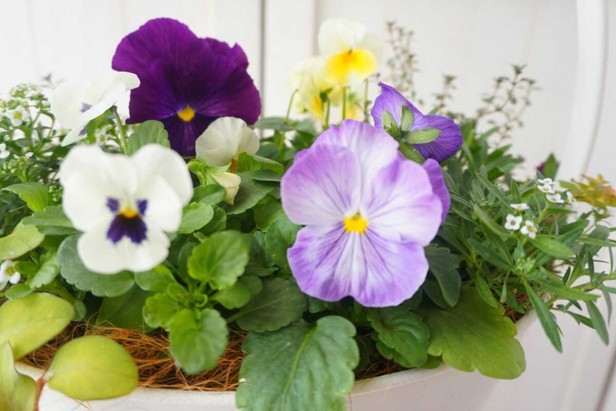 パンジービオラとアリッサムの寄せ植えです(^^)ブルー系のカラーで合わせてみました♪アリッサムのお花も入っていて、お花畑のような寄せ植えになってます(^^)寒さにも強い品種を選んでいるので春まで長く楽しめます♪