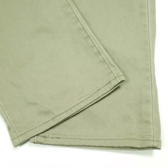ウォッシュ加工が施された9.6オンスのへビーサテン地で仕上げた5ポケットパンツ。