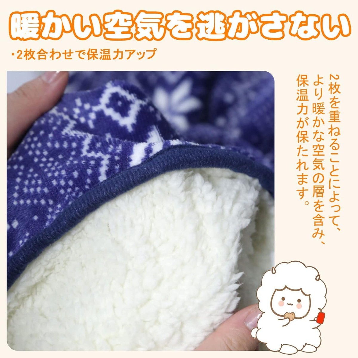 【2枚合わせで保温力アップ】表面はフランネルプリントで、内側はラムウールを使うので、柔らかくふわふわとした生地で軽いです。2枚を重ねることによって、より暖かな空気の層を含み、保温力が保たれます。