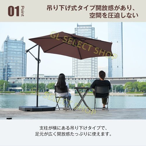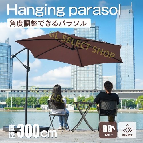 • 【広々とくつるげるワイド】空間を妨げない吊り下げタイプ支柱が邪魔にならない吊り下げタイプなので、パラソル下を無駄なく広々使えます。 広げると傘径約300cmになる大型パラソル。 アウトドア用のテープルと椅子をすっぱりカバーできるほど広いです!