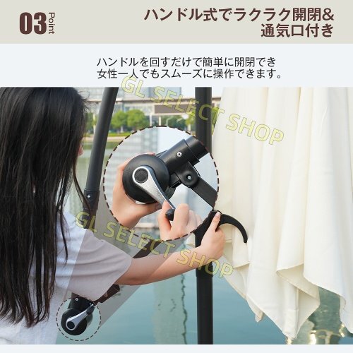 • 【ハンドル式でラクラク開閉& 通気口付き】ハンドルを回すだけで簡単に開閉でき女性一人でもスムーズに操作できます。傘上部に通気口付きで熱こもりにくいです。