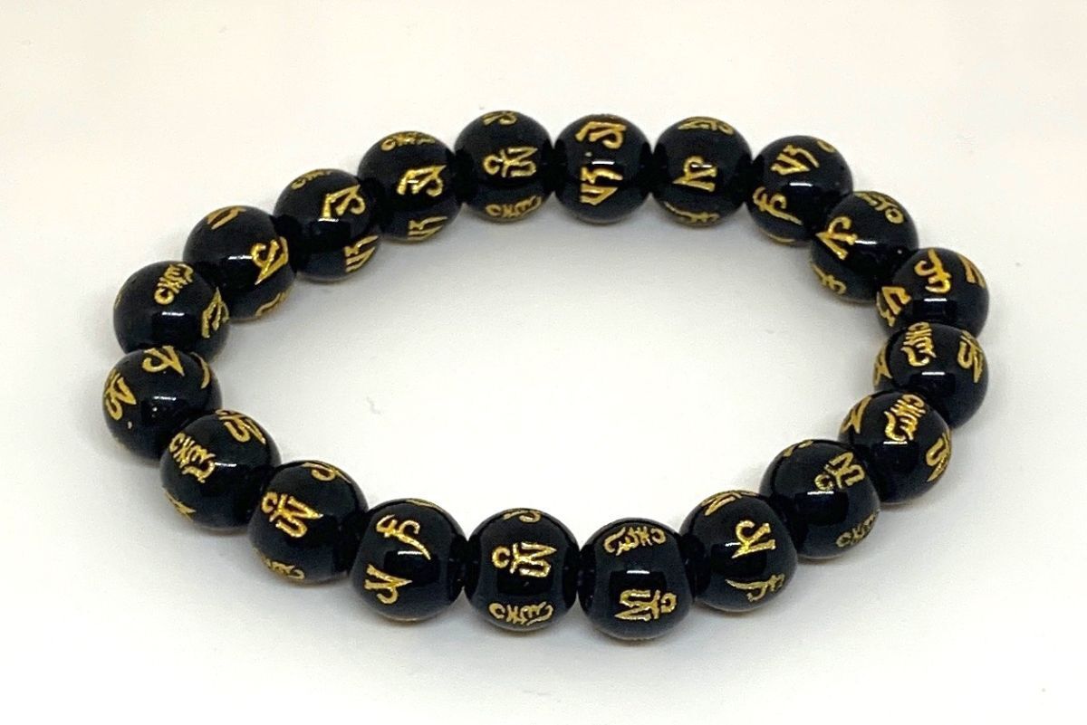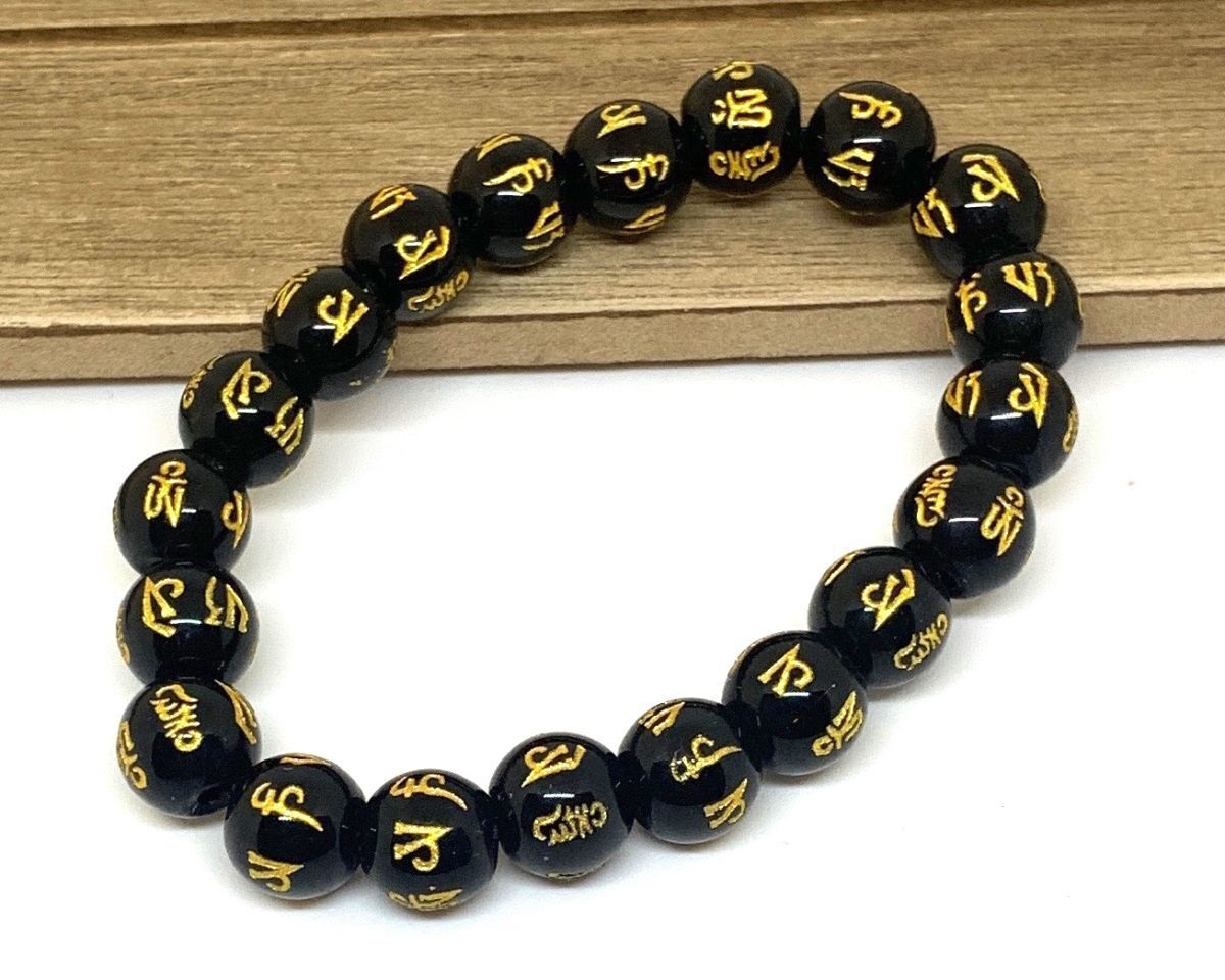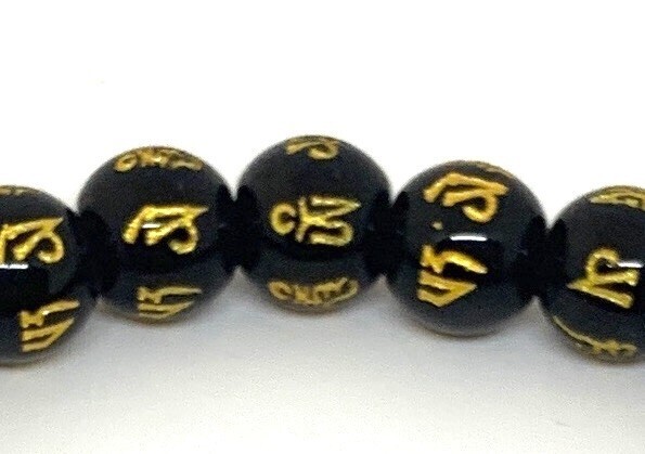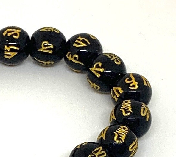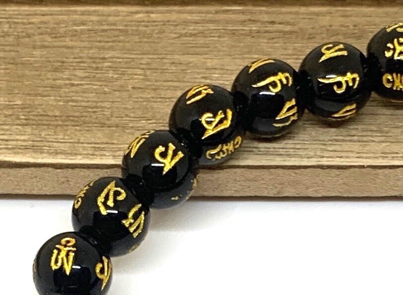 【Premio Fortuna】黒樹脂六字真言(マントラ)ブレスレット 10ミリ珠 全珠に金の真言刻印 t8UuSeK3 036