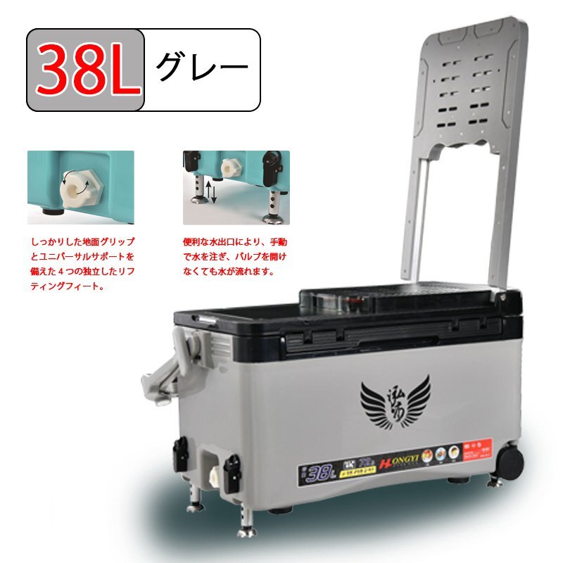 釣り用クーラーボックス 38L 大容量頑丈ボディ 保温保冷 ハンドル/釣りエサ箱/背もたれ/水栓付き 釣り 防水 グレー hw702gy
