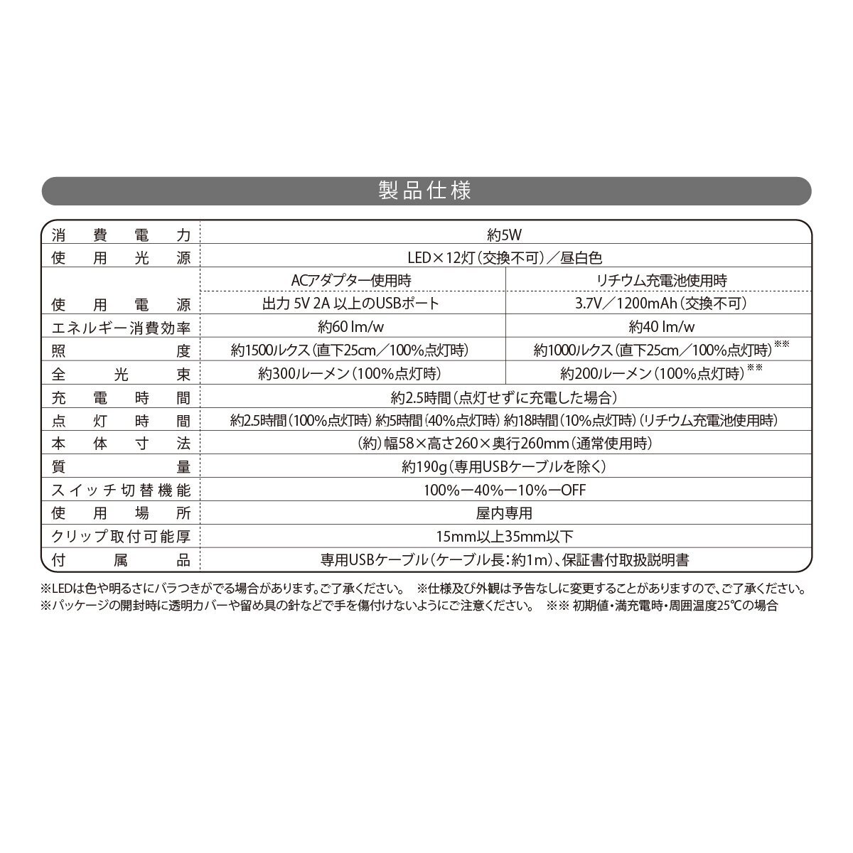 ■ 照度:ACアダプター使用時…約1500ルクス(直下25cm/100%点灯時)、リチウム充電池使用時…約1000ルクス(直下25cm/100%点灯時) ※初期値・満充電時・周囲温度25℃の場合