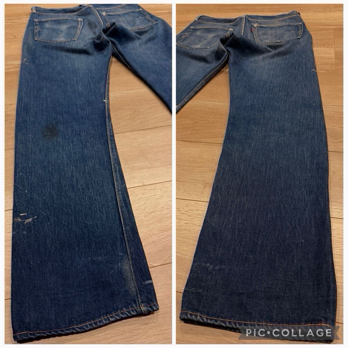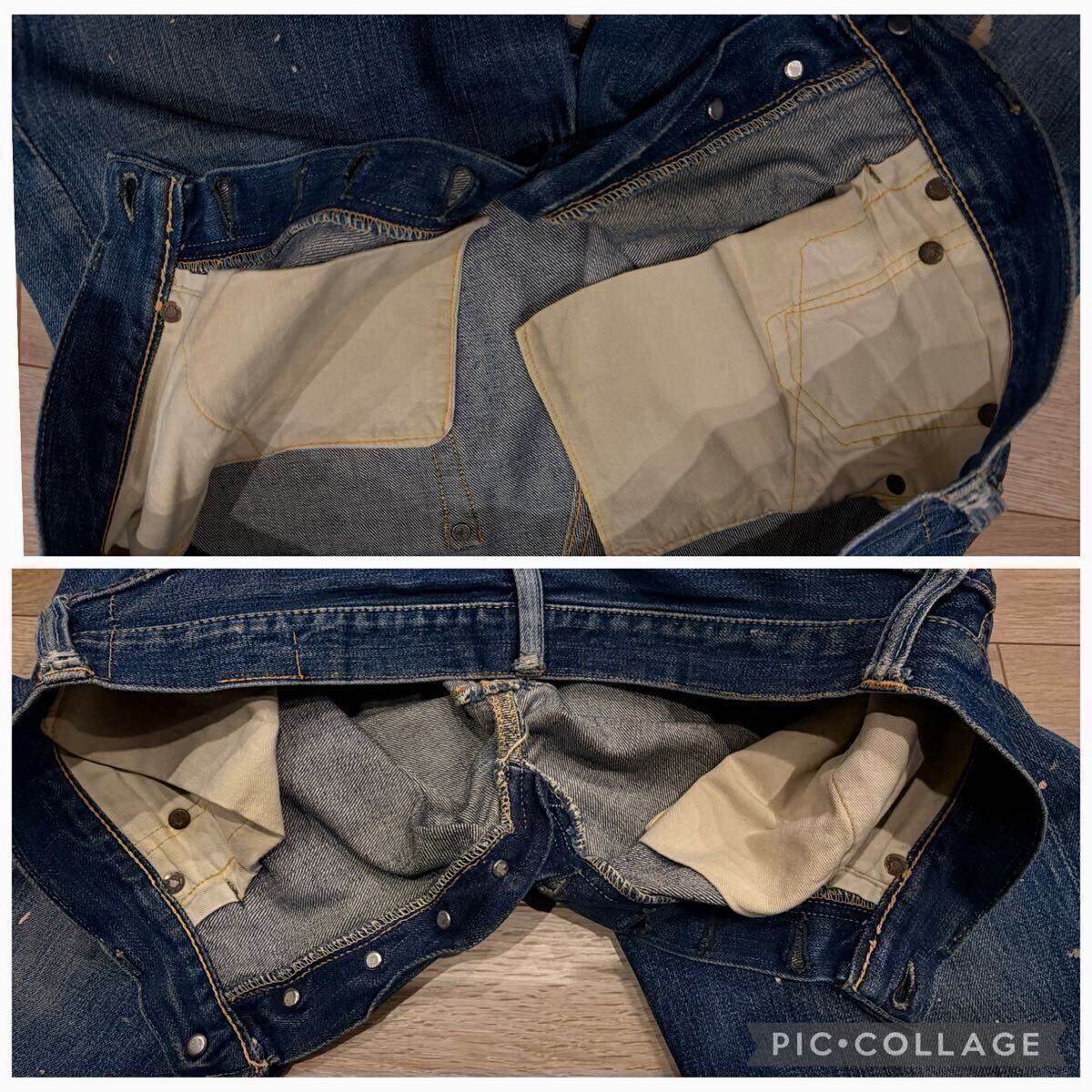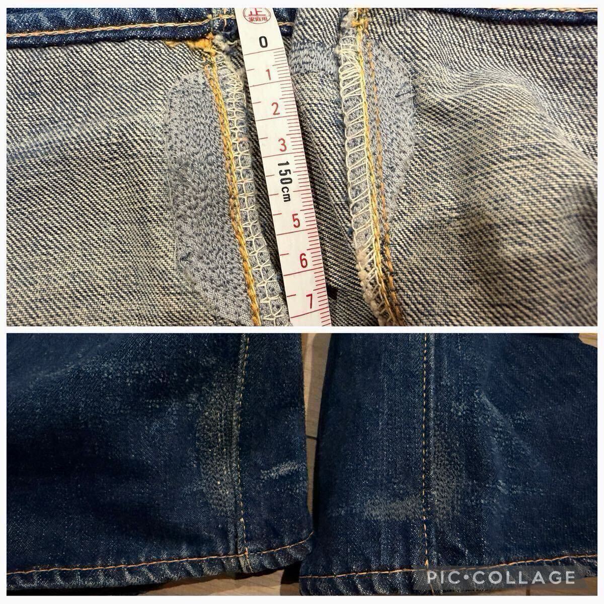 【商品説明】 ※通称47モデルと呼ばれているジーンズで当時もののオリジナルです。 1947年~1952年までに製造されたモデルのうち、後期モデルに該当すると思われます。 当時のペンキが付いた雰囲気のあるカッコいいデニムは唯一無です。 ※本気でほしい方お譲りしたいと思います。 確認したい点がありましたら、お気軽に質問からコメント下さい♪ ・1950年~52年までのリーバイス LEVI'S 501XXオリジナル ※どす黒いインディゴで裾部分の色残りが濃いのはこの時代の501XXの特徴です。 ※501XXの中でも完成形と言われ人気のモデルになります。 ・トップボタン裏:無刻印、隠しリベット15刻印(シーデリア工場、のちにS→5) ・フライボタン4個:下地はフラット ・ベルトループ:ライトオンスの極太ベルトループ ・革パッチ:欠損 ・リベット:浅めの刻印であり、中央寄りではない ・オール綿糸 ・赤タブ:恐らく片面タブ ※赤タブの表と裏部分が擦れており、裏側のタブは表側の刺繍の一部が見えている状態であり 片面タブであったと推測されます。 レジスターマークも見当たらなく、赤タブ以外のディテールから47モデルの可能性が高いと思います。 ・オリジナルレングス 【商品状態】 ・左足の膝あたりに3ミリほどのピンホールあり。 ・両足裾部分内側にタタキリペアあり。 ※リペア専門店にてかなり分からないようにリペアしてあります。 写真だとリペアの糸が白っぽく写っているように見えますが、現物は生地と非常に馴染んでおり綺麗です。 ・左足膝後ろにオイル汚れのようなシミあり。 ・全体的にペンキ汚れあり。 ※色残りは50%~70%、特に裾部分は濃い目です。 この時代のXXは、裾部分の色落ちがしにくく色落ちが濃淡になります。 【サイズ】 ・革パッチ:欠損 ・ウエスト:約80cm(平置き×2) ・レングス:約78cm ・総丈:約106cm ・股上:約30cm ・ワタリ:約31cm ・裾幅:約21.5cm ※商品の状態は複数の画像にて、ご判断頂ければと思います。 ※あくまでも中古品ですので、細かいことを気にされる方は、慎重に購入をご検討願います。 |