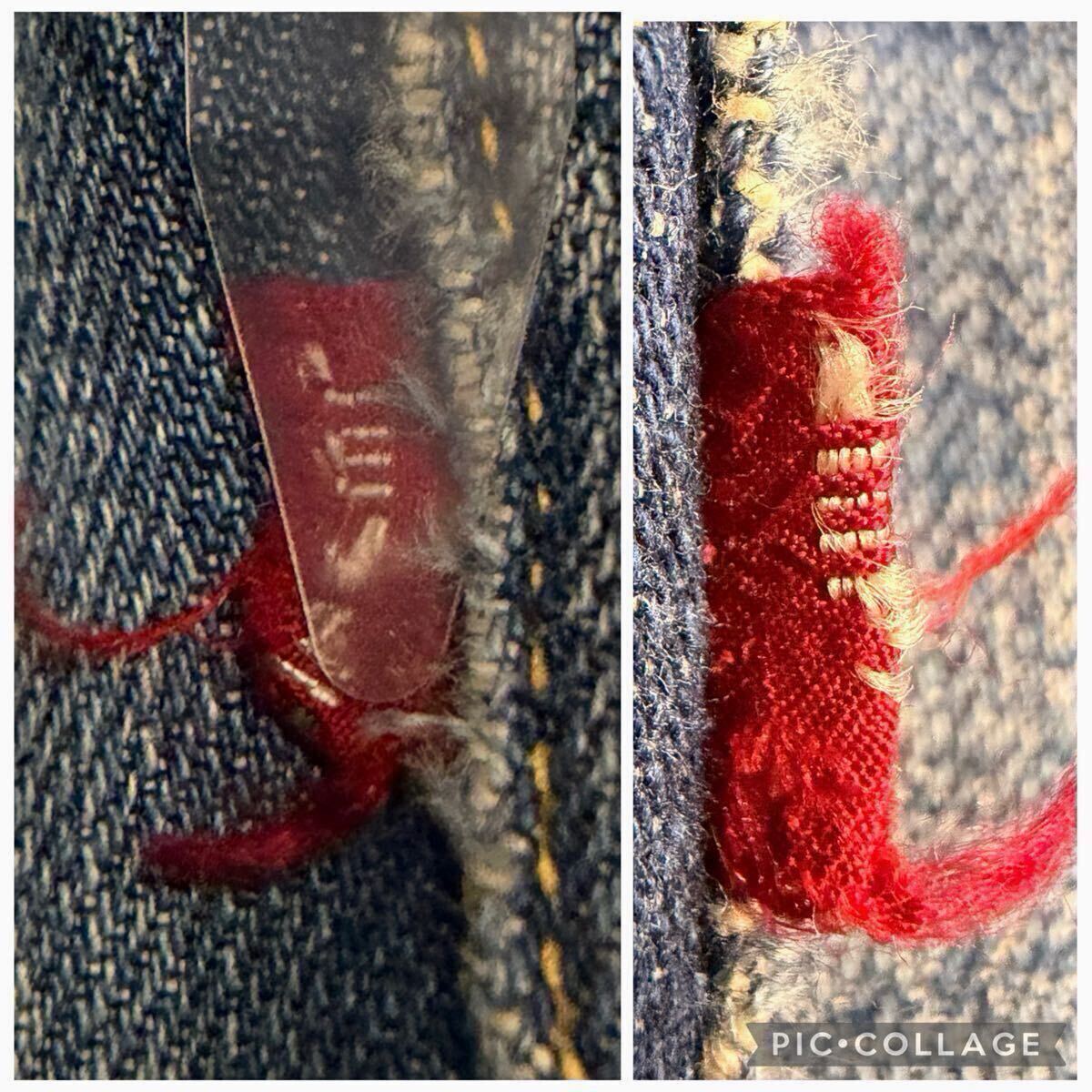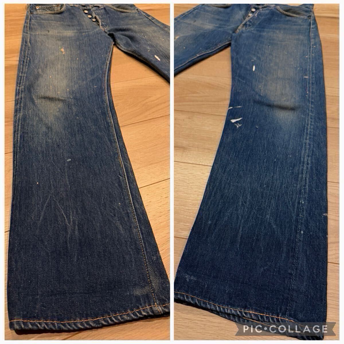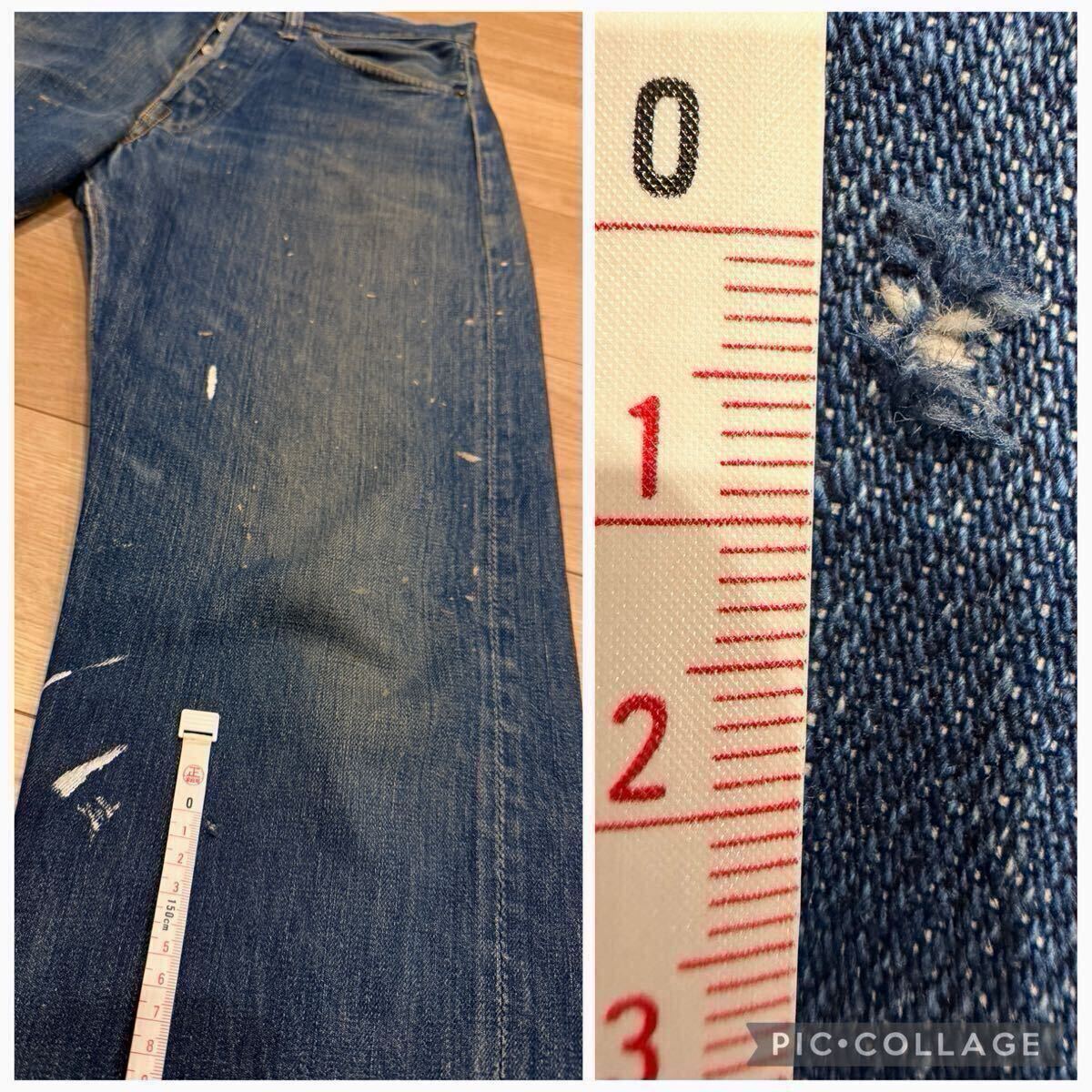 【商品説明】 ※通称47モデルと呼ばれているジーンズで当時もののオリジナルです。 1947年~1952年までに製造されたモデルのうち、後期モデルに該当すると思われます。 当時のペンキが付いた雰囲気のあるカッコいいデニムは唯一無です。 ※本気でほしい方お譲りしたいと思います。 確認したい点がありましたら、お気軽に質問からコメント下さい♪ ・1950年~52年までのリーバイス LEVI'S 501XXオリジナル ※どす黒いインディゴで裾部分の色残りが濃いのはこの時代の501XXの特徴です。 ※501XXの中でも完成形と言われ人気のモデルになります。 ・トップボタン裏:無刻印、隠しリベット15刻印(シーデリア工場、のちにS→5) ・フライボタン4個:下地はフラット ・ベルトループ:ライトオンスの極太ベルトループ ・革パッチ:欠損 ・リベット:浅めの刻印であり、中央寄りではない ・オール綿糸 ・赤タブ:恐らく片面タブ ※赤タブの表と裏部分が擦れており、裏側のタブは表側の刺繍の一部が見えている状態であり 片面タブであったと推測されます。 レジスターマークも見当たらなく、赤タブ以外のディテールから47モデルの可能性が高いと思います。 ・オリジナルレングス 【商品状態】 ・左足の膝あたりに3ミリほどのピンホールあり。 ・両足裾部分内側にタタキリペアあり。 ※リペア専門店にてかなり分からないようにリペアしてあります。 写真だとリペアの糸が白っぽく写っているように見えますが、現物は生地と非常に馴染んでおり綺麗です。 ・左足膝後ろにオイル汚れのようなシミあり。 ・全体的にペンキ汚れあり。 ※色残りは50%~70%、特に裾部分は濃い目です。 この時代のXXは、裾部分の色落ちがしにくく色落ちが濃淡になります。 【サイズ】 ・革パッチ:欠損 ・ウエスト:約80cm(平置き×2) ・レングス:約78cm ・総丈:約106cm ・股上:約30cm ・ワタリ:約31cm ・裾幅:約21.5cm ※商品の状態は複数の画像にて、ご判断頂ければと思います。 ※あくまでも中古品ですので、細かいことを気にされる方は、慎重に購入をご検討願います。 |
