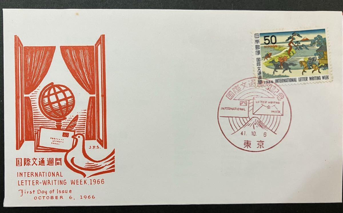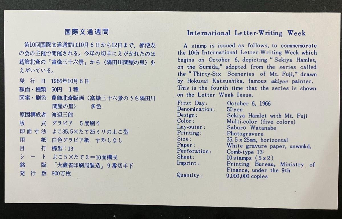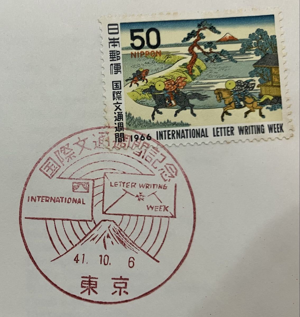 [FDC]国際文通週間 北斎画 富嶽三十六景「隅田川関屋の里」50円 1966.10.6 初日カバー