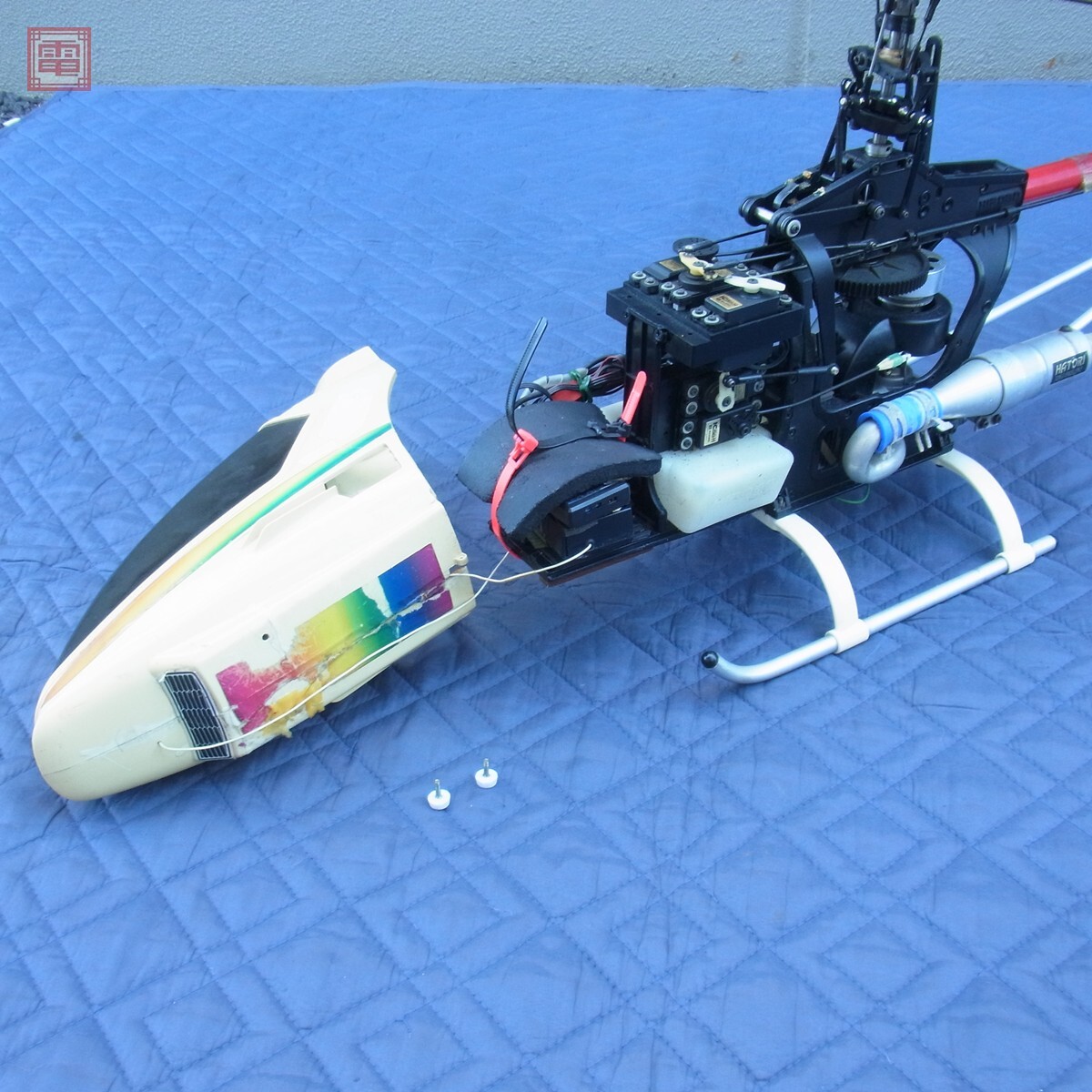 ジャンク ヒロボー エンジンRC シャトル ZXX エンジンRC/ジャイロ/受信機/サーボ搭載 全長約110cm 動作未確認 ラジコン ヘリコプター ■動作未確認、状態が悪いためジャンク品として出品しておりますので、どの様な不具合が生じましても当店では交換・返金・返品等の対応はできません。 ■ご理解ご納得いただける方のみご入札をお願いいたします。 ■本商品はメンテナンスが必要な商品となります。 ■メンテナンスができる方のみのご入札をお願いいたします。 <搭載> ・エンジン:OS MAX 32F ・ジャイロ:フタバ G301 ・受信機:詳細不明 ・サーボ:サンワ CONTEST-HP×3/ICスタントBB-H×2 ■機体等を分解して内部の状態や細かな箇所までは検品を行っておりません。 ■キャノピーにヒビや修復痕があります。 ■全体的に埃等の汚れ、スレ、キズ、イタミ、ヤケがあります。 ■テープやシールの貼り付けがあります。 ■前所有者様の飛行/墜落/修復歴/製作時期等は不明です。屋内/屋外等使用されていた環境等も一切不明です。 ■上記以外は未チェックです。 ■梱包には細心の注意を払っておりますが、輸送中に部品脱落や破損など発生する場合があります。 【無人航空機の登録について】 2022年6月20日より無人航空機の登録が義務化となりました。 登録につきましてはご落札者様にてお願いいたします。 詳細につきましては、 https://www.mlit.go.jp/koku/drone/ にてご確認ください。 ■写真のものが全てです。付属物の有無や状態については写真からご判断ください。 ■付属物については細かいチェックはしておりませんので、万が一、欠品があったり余計な物が入っていたとしてもご了承ください。 ■商品到着後、当店の保証期間中は、商品及び箱や取説、付属品などを1つでも廃棄や破損をしないようにお願い致します。廃棄や破損をした場合、商品に問題があった場合でも対応や返金などの対処ができなくなります。 ■商品によりますが、発売されてから10年以上経過している中古品である事をご理解頂いた上でご入札をお願い致します。なお、新品や美品、また特記事項がある場合は別途明記します。 | |||