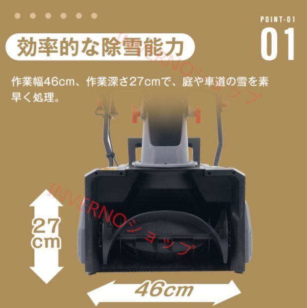 • 【効率的な除雪能力】作業幅46cm、作業深さ27cmで、庭や車道の雪を素早く処理。【長距離の雪飛ばし最大6mの投雪距離で、完全な除雪を実現。