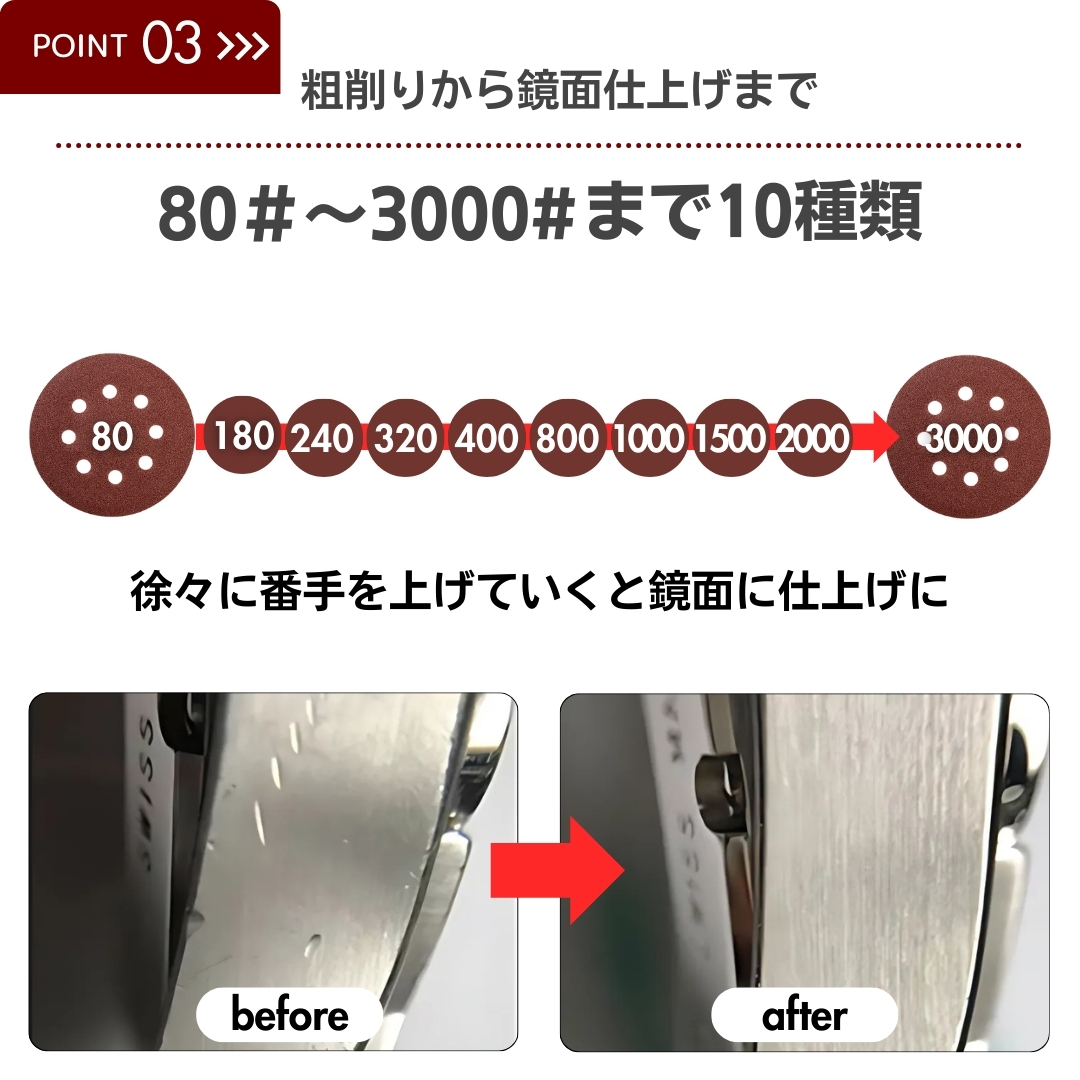 ● 粗削りから鏡面仕上げまでできる10種類:#80〜#3000を網羅し、荒取り〜下地整え〜最終仕上げまで一括対応。