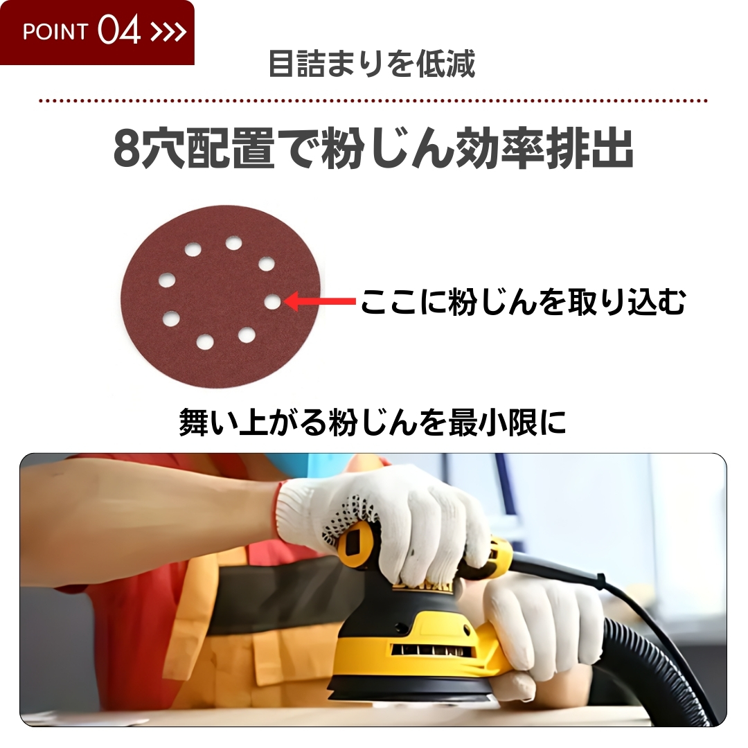 ● 8穴配置で粉じん効率排出:集じん穴が研削粉を効率的に吸引し、目詰まりを低減して寿命を延ばします。