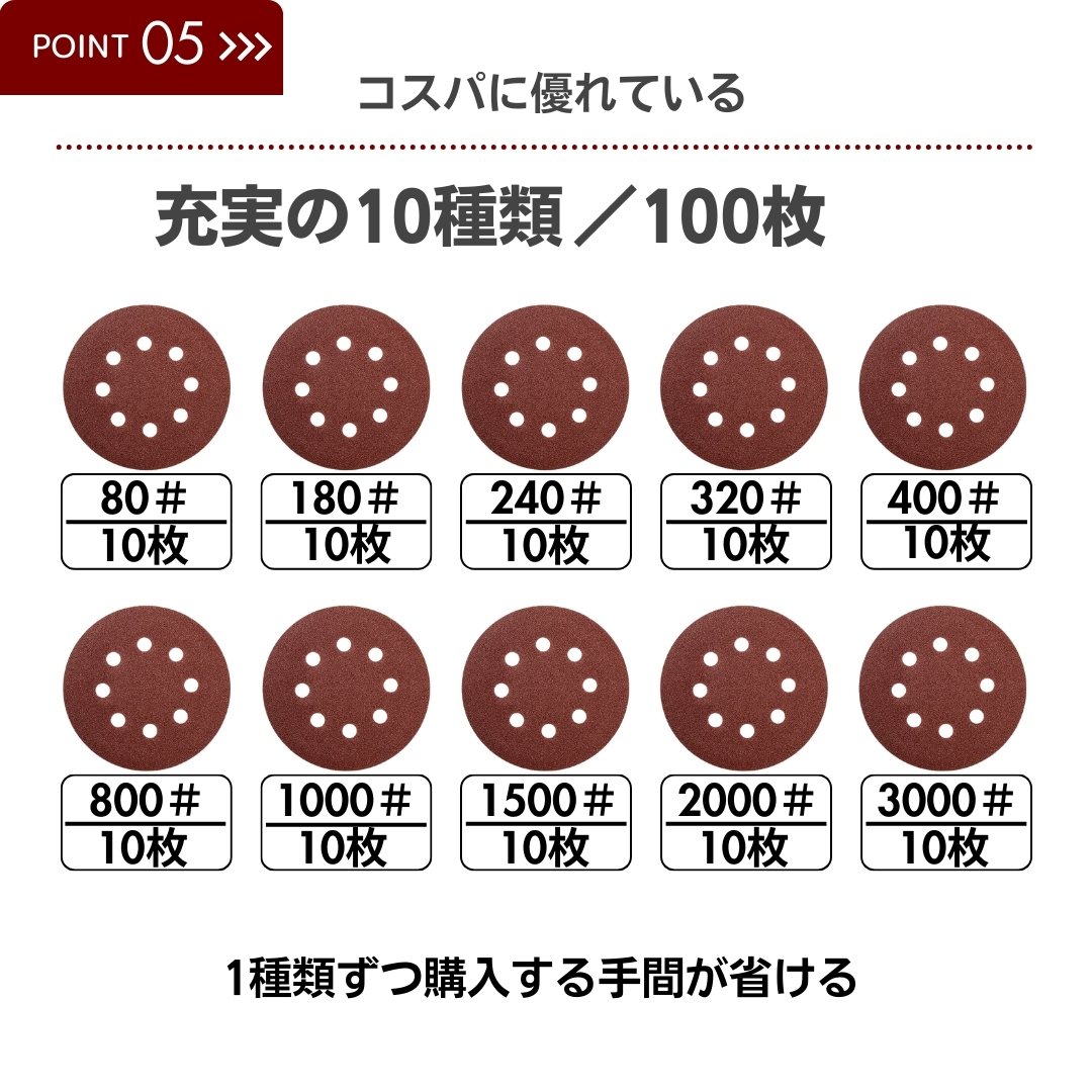 ランダムサンダー用のディスクサンドペーパー10種100枚セットです。