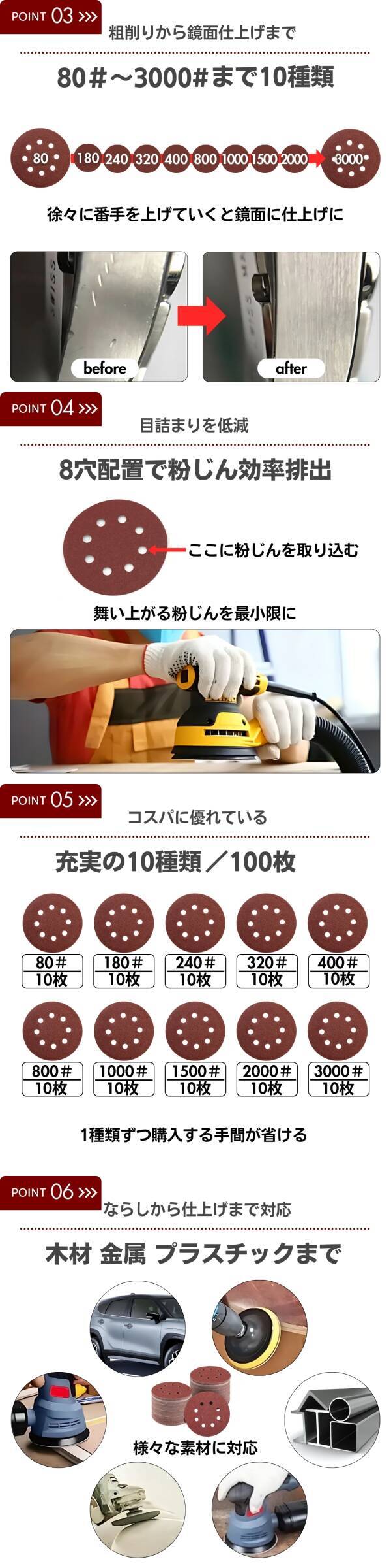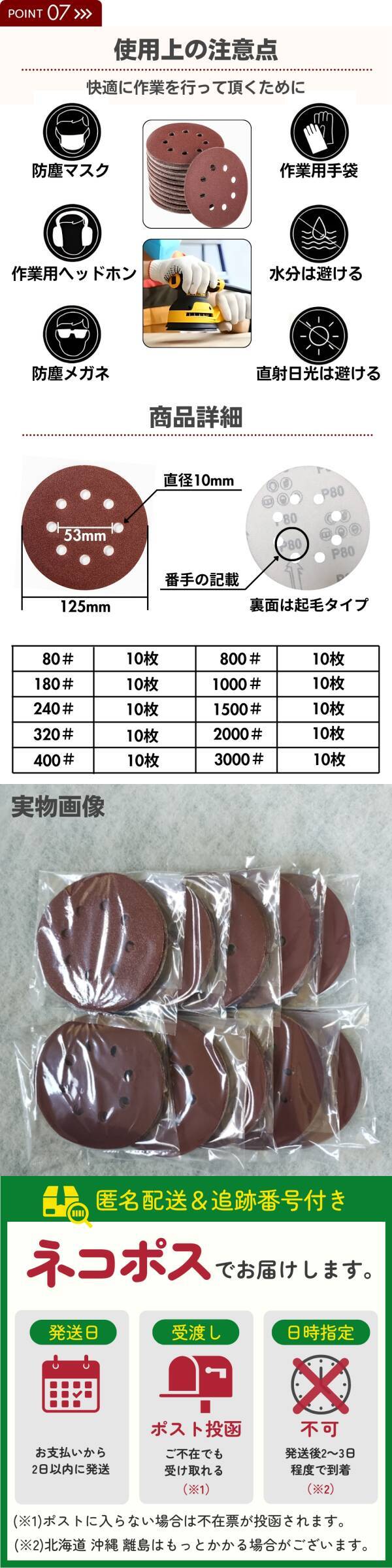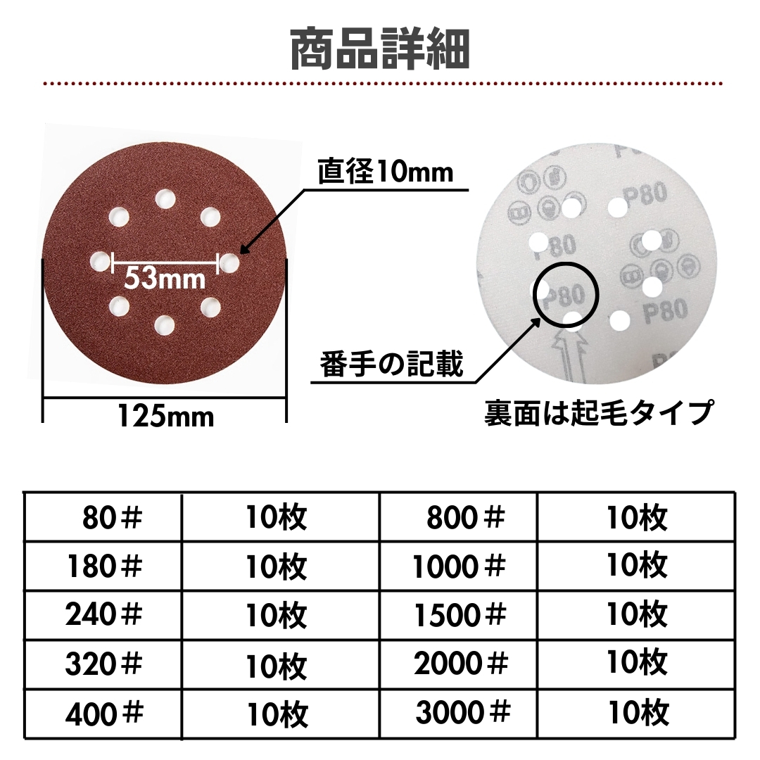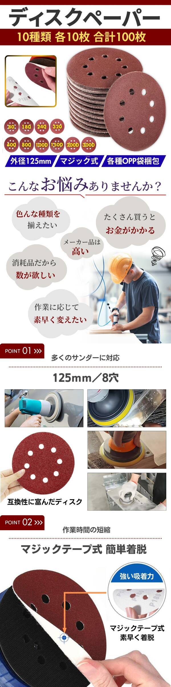 ディスク サンド ペーパー ランダムサンダー 紙やすり 研磨 研削 加工 10種 100枚 マジックテープ グラインダー DIY 集塵 8穴 D125mm diy